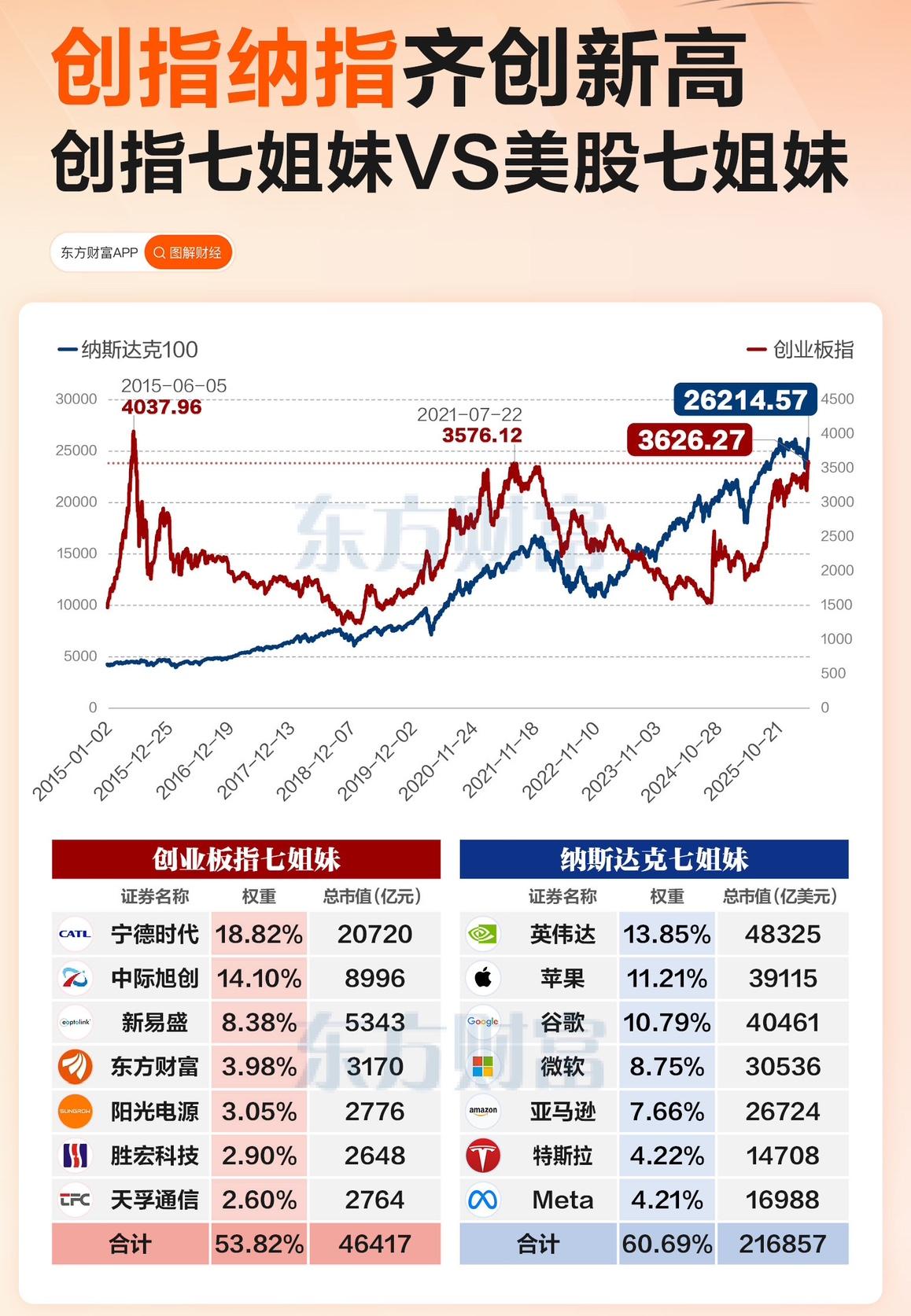 创指七姐妹 VS 美股七姐妹:[击掌]中美龙头格局大比拼 近期,创业板指与纳斯达克100指数同步刷新阶段新高,支撑两大指数行情的核心力量,正是各自的“七姐妹”龙头阵营。两组龙头的市值体量、产业底色与市场影响力,折射出中美科技成长赛道的鲜明差异。 先看创业板指的“七姐妹”,宁德时代稳居榜首,总市值达20720亿元,是指数的绝对压舱石。紧随其后的中际旭创、新易盛,代表了A股在光模块、AI算力基础设施上的核心力量,成为近期行情的重要推手。东方财富作为“券商茅”,承载着资本市场活跃度的晴雨表功能;阳光电源延续了新能源赛道的龙头地位;胜宏科技、天孚通信则分别在PCB、光器件领域占据关键位置。七家公司合计撑起了创业板指的半壁江山。整体来看,A股“七姐妹”呈现“新能源+AI算力+金融”的混合格局,宁德时代的电池、中际旭创的光模块仍是核心主线。 再看纳斯达克的“七姐妹”,英伟达领跑,总市值高达48325亿美元,是AI浪潮的全球风向标。苹果、谷歌、微软三大巨头紧随其后,构成了美股科技的“铁三角”,分别代表消费电子、搜索引擎与企业软件的全球龙头。亚马逊、特斯拉、Meta则覆盖电商、新能源汽车与社交AI领域。七家公司合计市值远超创业板“七姐妹”的规模。美股“七姐妹”的产业集中度更高,AI、消费电子与云服务的主线清晰,英伟达更是凭借AI算力的核心优势,成为指数上涨的核心引擎。 对比来看,两组“七姐妹”的差异一目了然。市值层面,美股“七姐妹”的总市值是A股的近4倍,单家龙头的体量差距显著;市场影响层面,美股龙头对指数的影响更集中,指数走势高度绑定科技巨头;产业层面,A股“七姐妹”仍以新能源、光模块等硬件制造为主,而美股“七姐妹”已形成AI全产业链、消费科技、云服务的综合生态。这背后,是中美科技产业发展阶段的差异,也为投资者提供了不同的成长与估值逻辑参考。 创业板综指 深创指数 美股对比 美AI科技股 股票纳斯达克 美股公司分析 创指行情