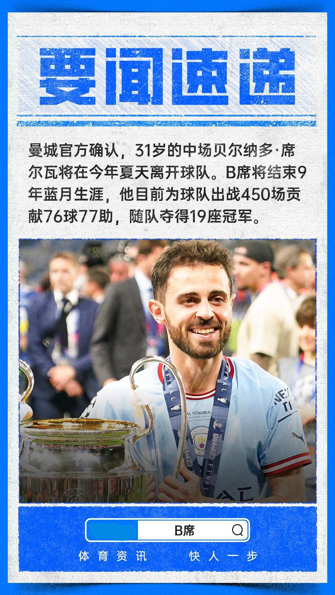 官方:B席本赛季结束后离开曼城,结束长达9年的曼城生涯,随队夺得19座冠军 4月16日 官方消息,31岁的葡萄牙中场贝尔纳多·席尔瓦将于本赛季结束后合同到期离开曼城,结束长达9年的曼城生涯,随队夺得了19座冠军,包括6座英超、5座联赛杯、3座社区盾杯、2座足总杯、1座欧冠、1座世俱杯以及1座欧超杯