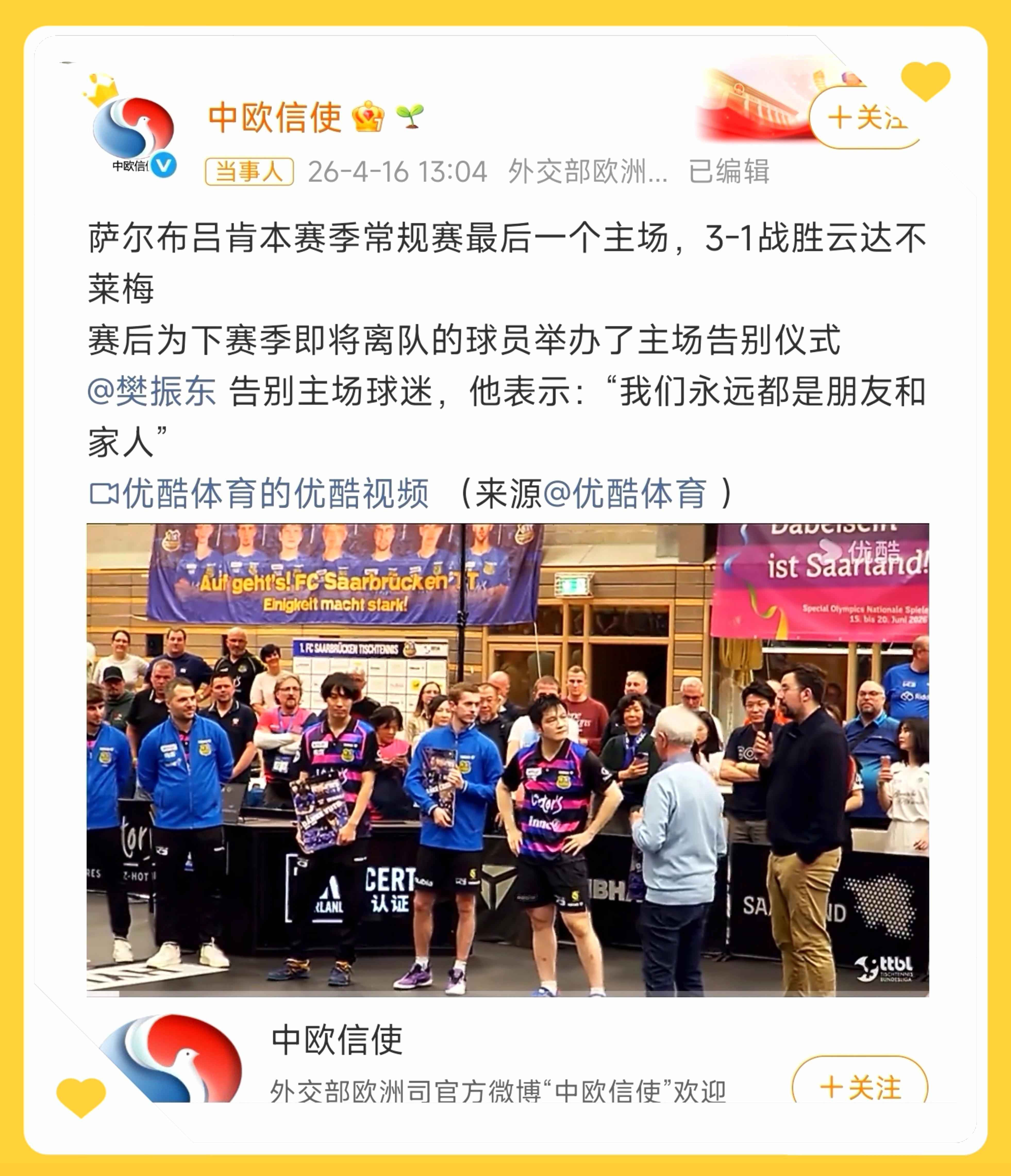 外交部欧洲司宣传樊振东独属于樊振东的顶级礼遇排面——外交部欧洲司以官方之名致敬乒坛现役唯一T0,一纸博文温情目送功勋英雄挥别主场荣光。樊振东精神力量一代宗师樊振东樊振东德甲之旅意义深远