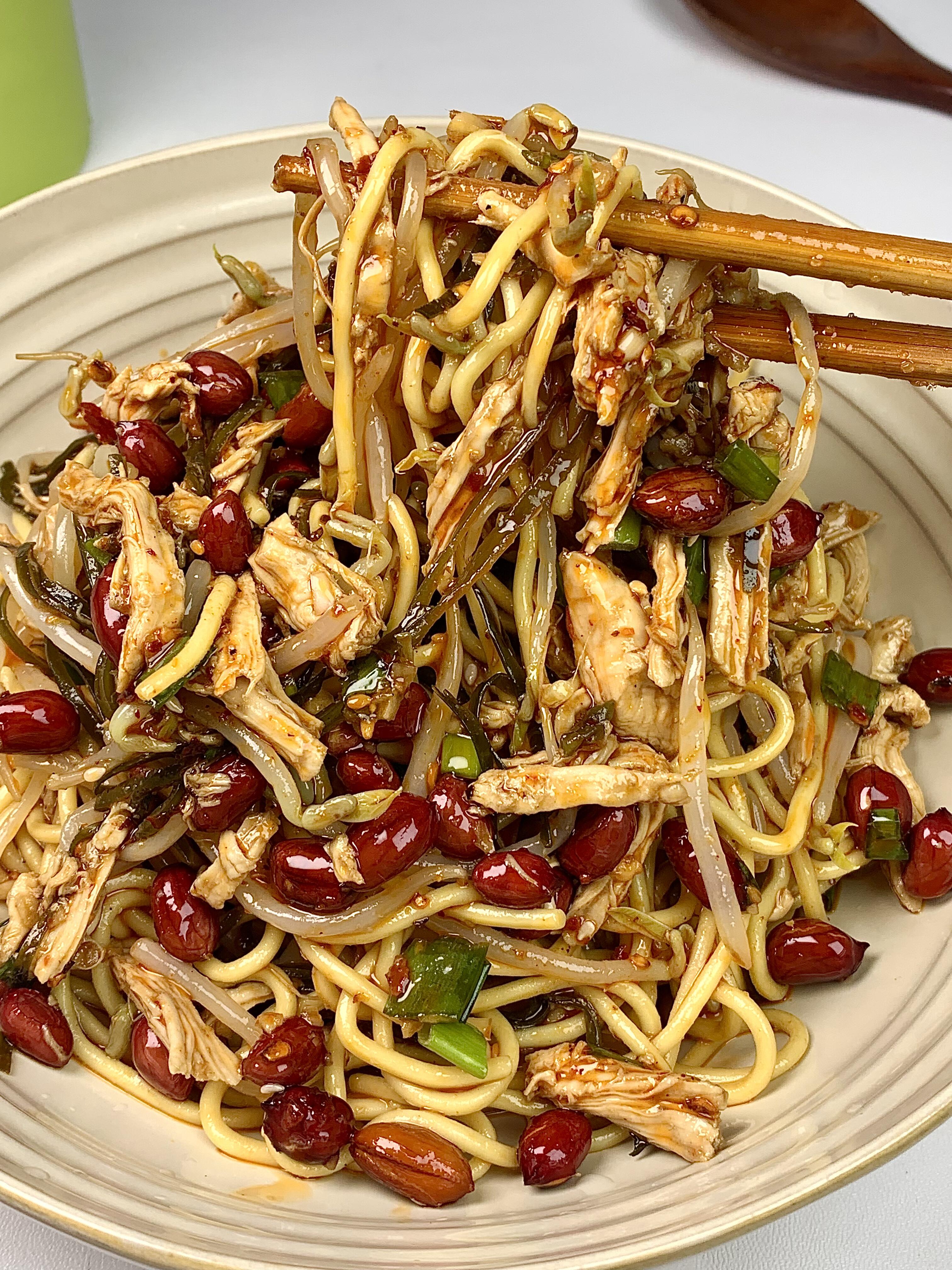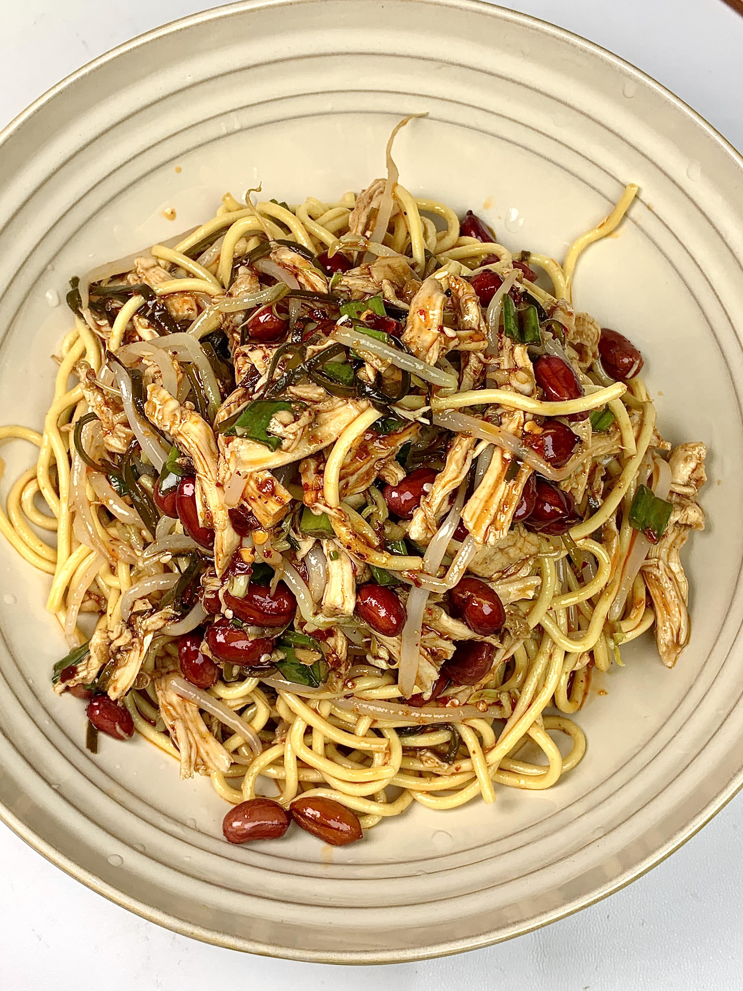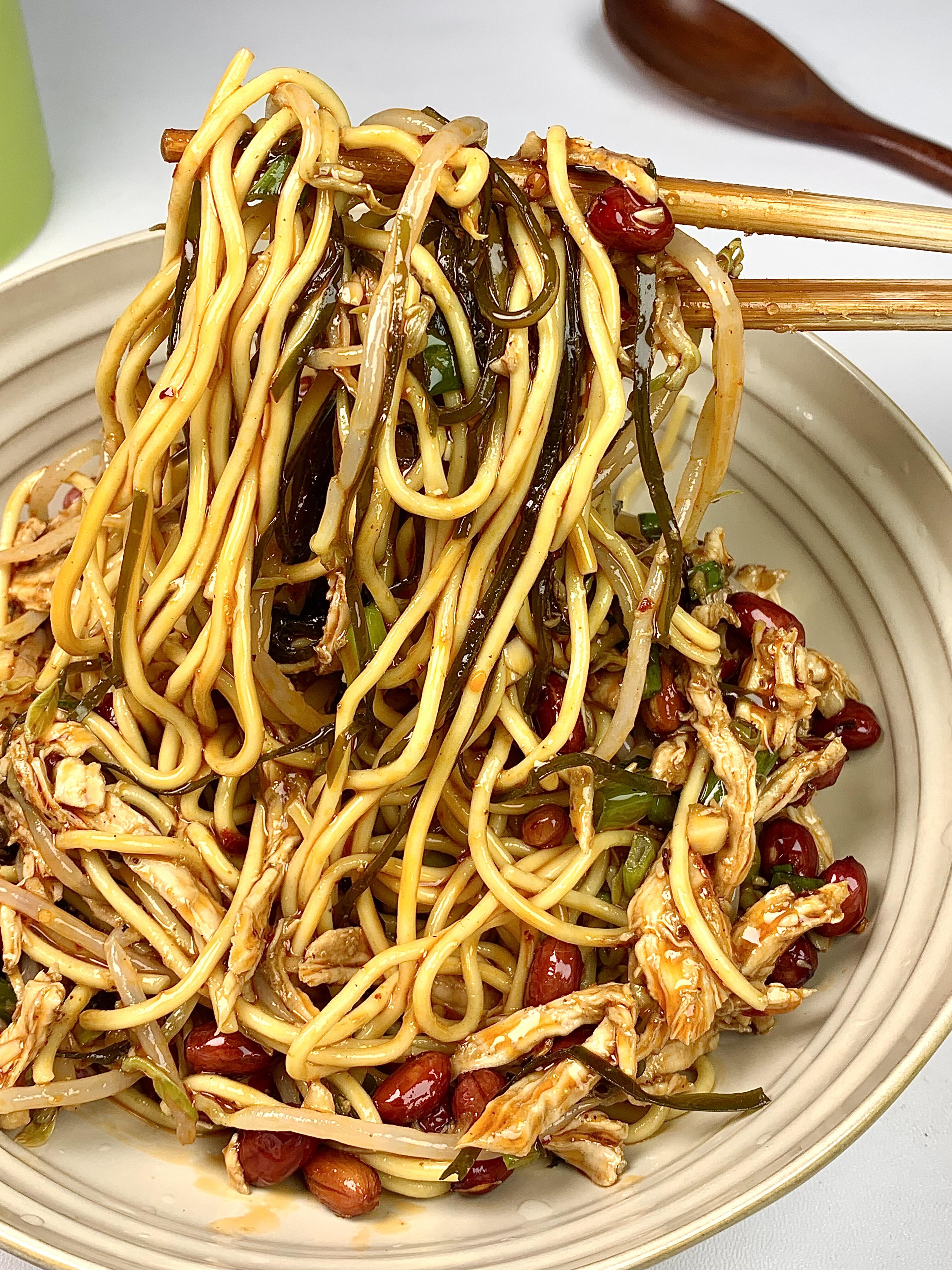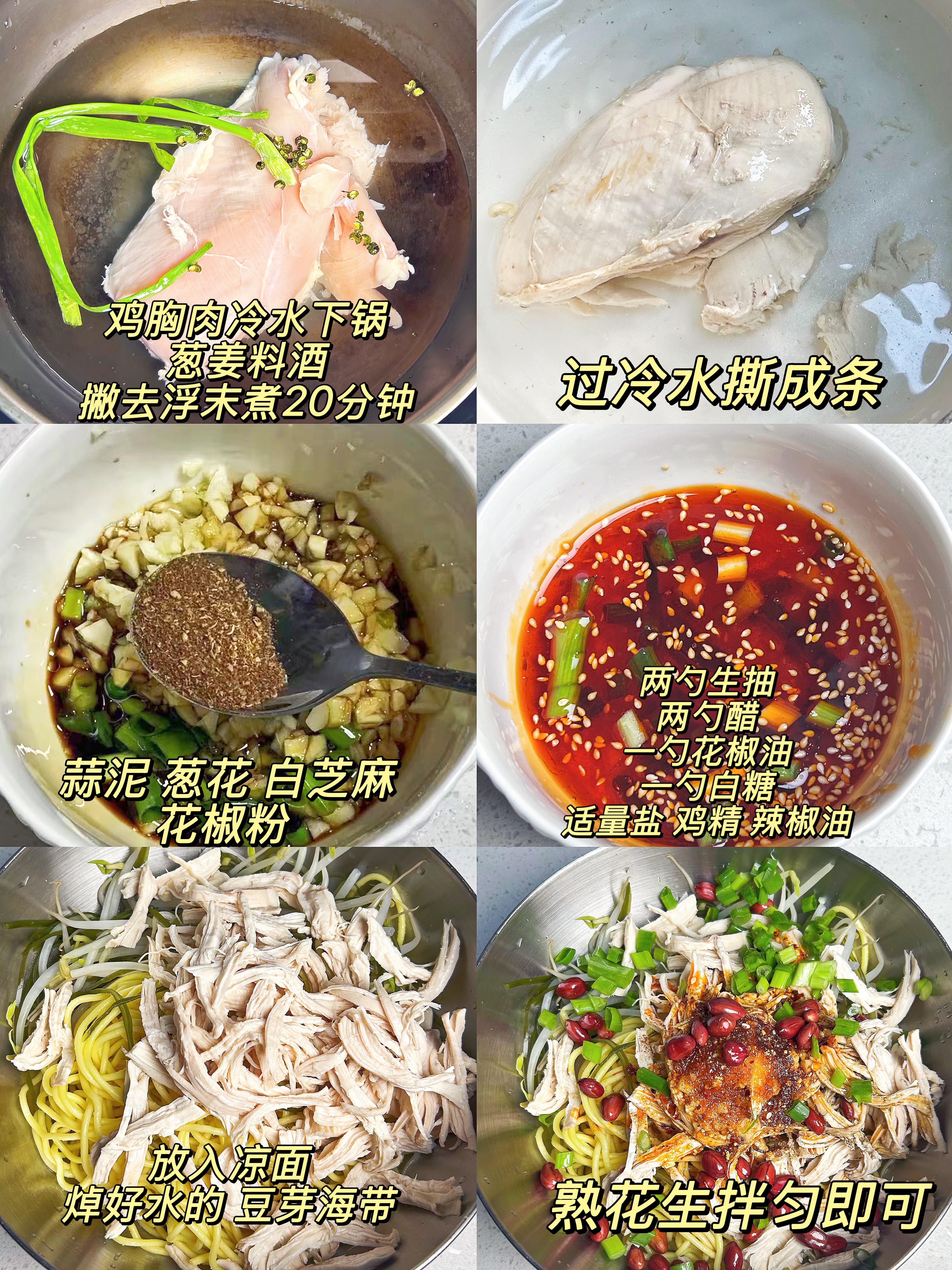 ✅ 详细做法(跟着做,酸香入味不踩坑) 1️⃣ 鸡胸肉冷水下锅,放入葱段、姜片,加少许料酒和花椒,大火煮开后,撇掉表面的浮沫,转中小火慢慢煮20分钟,确保鸡胸肉完全煮熟。 2️⃣ 煮好的鸡胸肉,立刻放入冰水(没有冰水用凉白开也可以)浸泡,这样能让鸡胸肉的肉质更紧实Q弹,一点不柴;等鸡胸肉放凉后,用手撕成细细的鸡丝,备用。 3️⃣ 碗中放入蒜泥水、葱花、白芝麻、花椒粉,加入2勺生抽、2勺醋、1勺花椒油、1勺白糖,再根据自己的口味,加适量盐、鸡精和一大勺辣椒油,最后放入熟花生米、焯好水的豆芽和海带,充分搅拌均匀,淋在鸡丝和凉面上就可以开炫啦!
