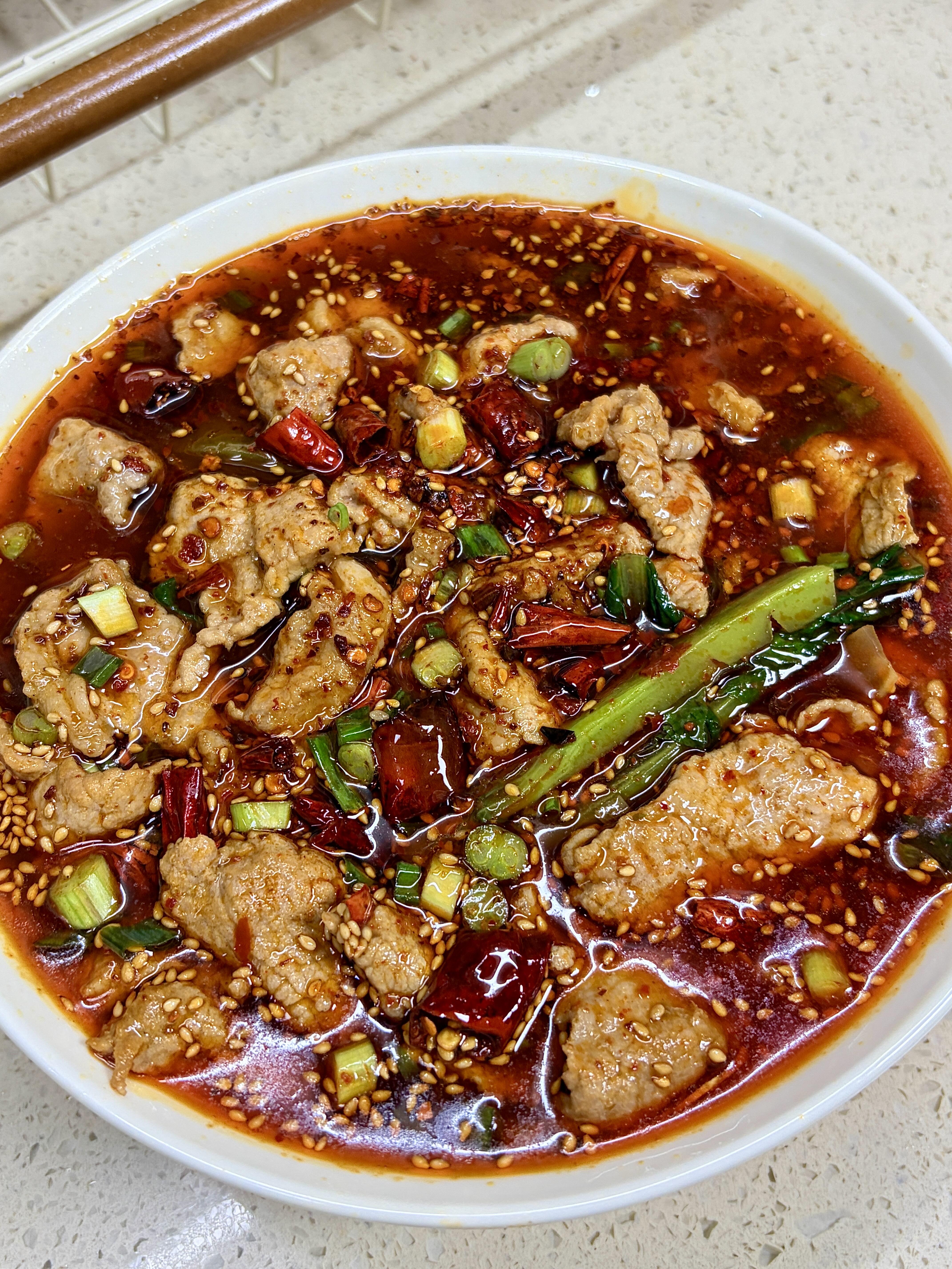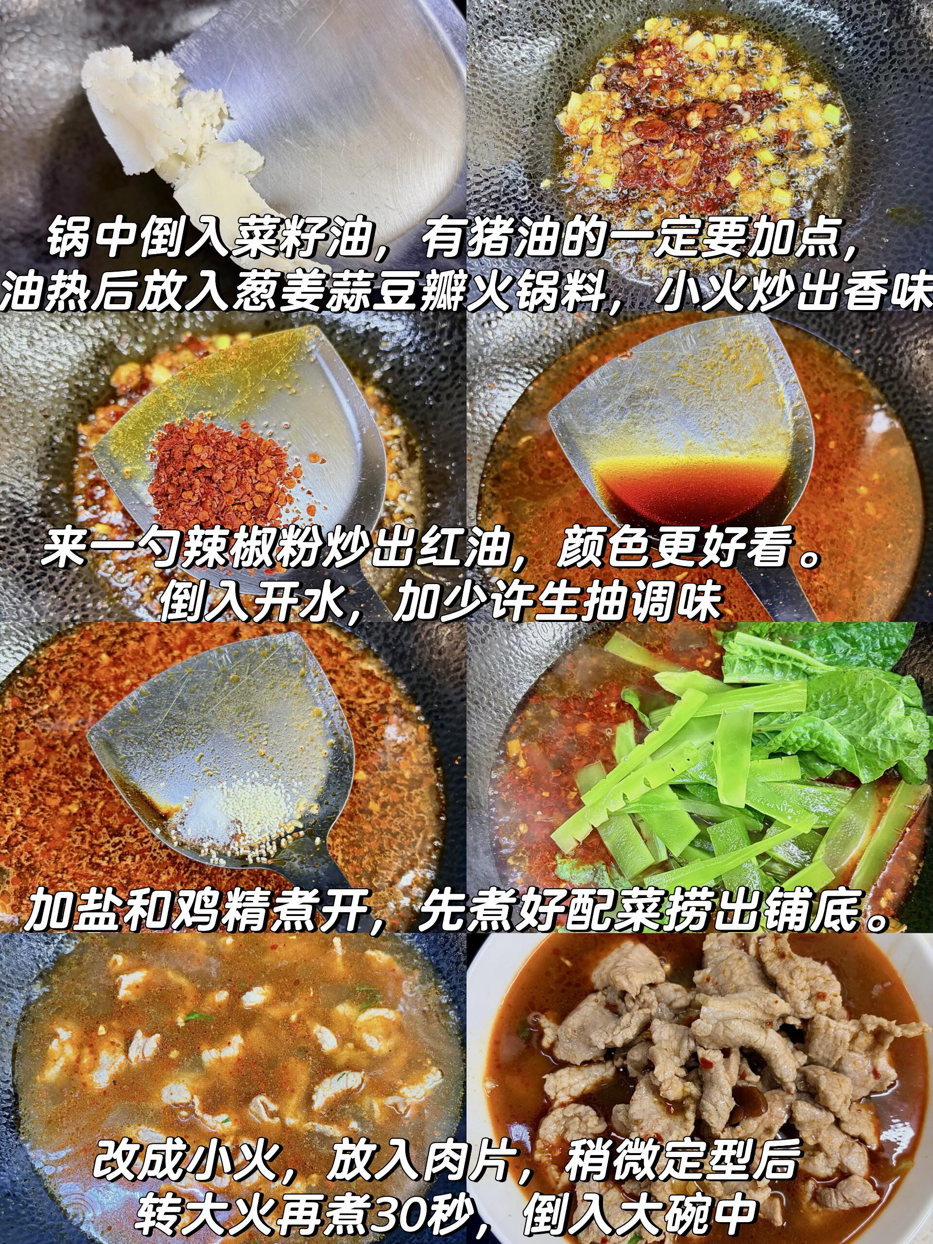 🍳 灵魂做法,一步都别错! 1️⃣ 猪肉切成薄片,加少许盐、白胡椒粉、1勺淀粉,再淋上适量清水,用手充分抓匀,直到肉片完全吸收水分,最后加1勺食用油拌匀,这样能锁水防粘,煮出来的肉片巨嫩滑不柴! 2️⃣ 锅中倒适量菜籽油,喜欢更香的可以加一勺猪油,油热后放入葱姜蒜爆香,再加入豆瓣酱和火锅料,转小火慢慢炒,炒出浓郁香味和红油就可以啦。 3️⃣ 接着加1勺辣椒粉,继续小火炒出红油,然后倒入足量开水,加少许生抽提鲜,再根据自己的口味加适量盐和鸡精,搅拌均匀煮开后,先把莴笋头和莴笋叶放进去煮熟,捞出铺在大碗底部备用。 4️⃣ 转小火,把腌好的肉片一片一片放进锅里,等肉片稍微定型后,转大火煮30秒就够了,看到肉片变色卷曲就立马关火,连汤带肉一起倒进铺好配菜的大碗里。 5️⃣ 最后灵魂一步!在肉片表面铺一层干辣椒段、1勺辣椒粉和1勺白芝麻,烧一勺热油,“滋啦”一声淋上去激香,瞬间香迷糊整个厨房,再撒点葱花点缀,直接开炫~