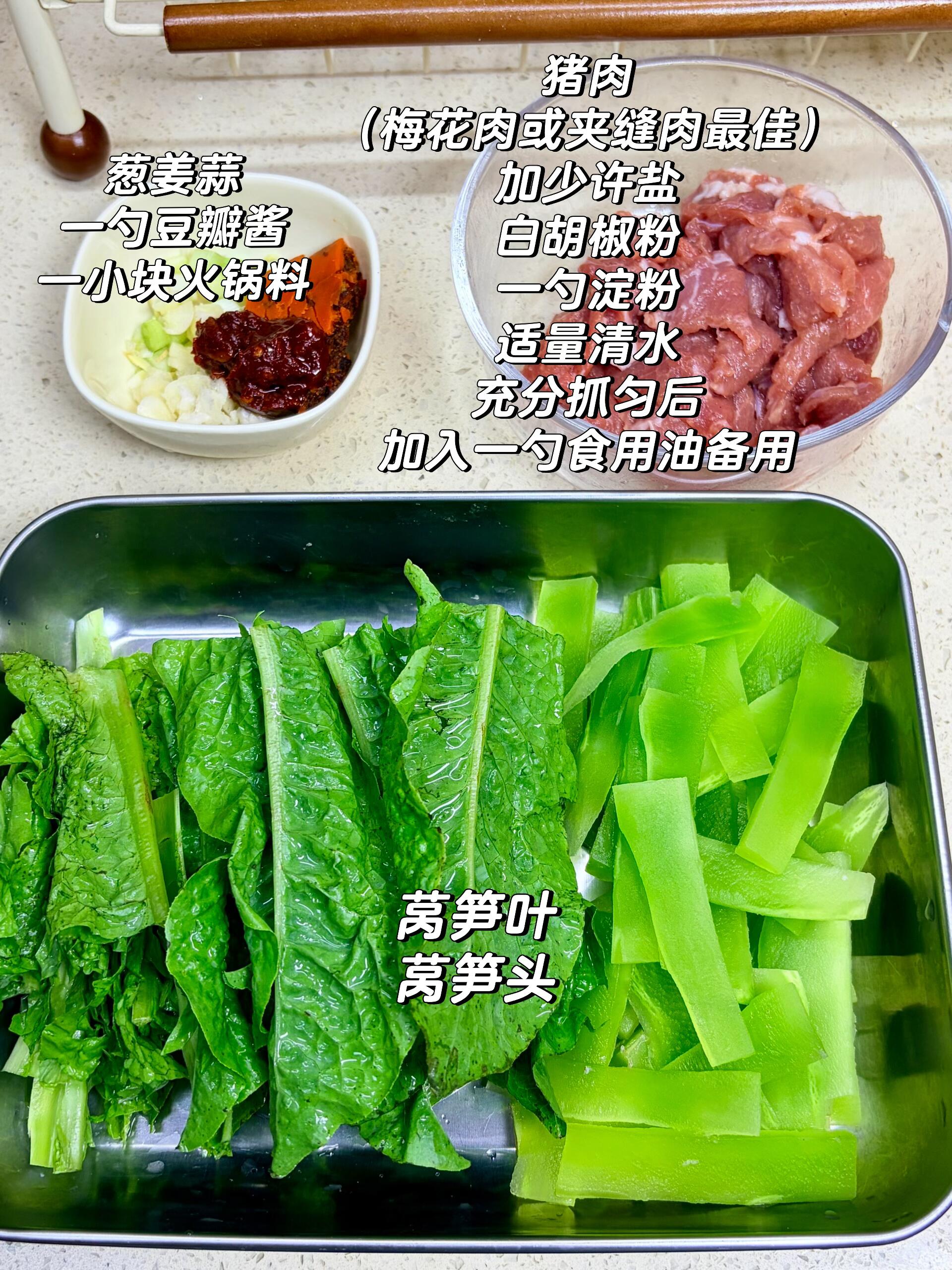 🥬 食材准备(家常量,够2-3人吃) 猪肉(首选梅花肉或夹缝肉,口感最嫩)、莴笋头、莴笋叶