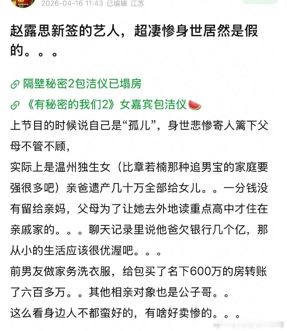 大家记得恋综上的包洁仪吗?也就是赵露思新签约的艺人,最近塌房了,在节目上的超凄惨身世是假的!最搞笑的是还关注了赵露思的死对头虞书欣