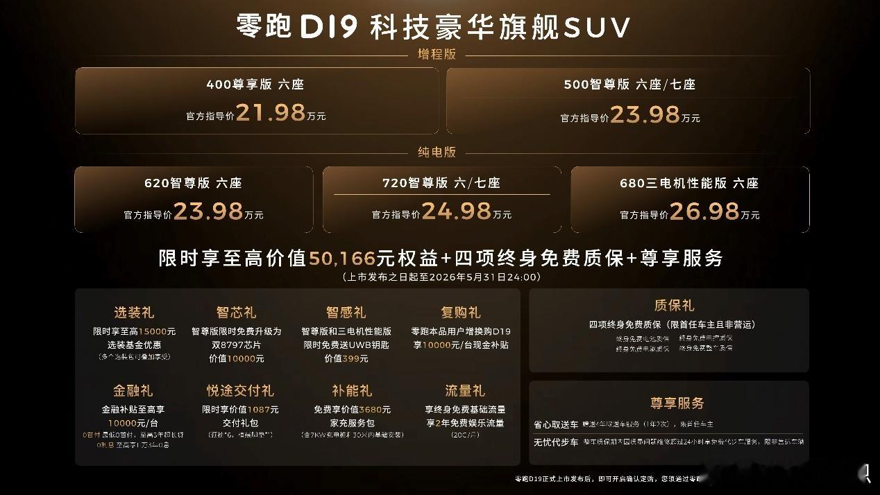 原来9系旗舰SUV价格也能这么香零跑发布会零跑D19满配豪华上市21.98万起今晚简直就是神仙打架,零跑D19今晚正式上市21.98-26.98万。代言人费翔亲临助阵,朱江明现场交付首台,品牌向上迈出关键一步。全域自研硬核打底,核心自研占比超65%,三排舒适平权,六/七座随心切换 。增程版400/500km纯电续航,纯电版620/720km超长续航,800V快充12分钟补能,加92号油无焦虑。3秒级三电机四驱+双腔空悬+魔毯底盘,5米大车转弯半径仅3.6米,好开又稳。双骁龙8797芯片+28颗感知硬件+VLA大模型智驾,AR-HUD+大联屏+车载制氧机,B&O音响、4D按摩、冷暖冰箱配齐。九横三纵笼式车身+2000Mpa热成型钢+十层电池防护,安全拉满。现在下定还能享5万+权益