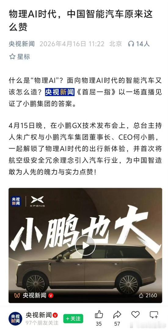 央视点赞小鹏GX首发航空级安全冗余央视背书+航空级安全冗余+720°碰撞满分,小鹏GX这波确实很顶!优点很实在:把飞机安全标准下放家用,极端情况双系统兜底,安全感直接拉满!