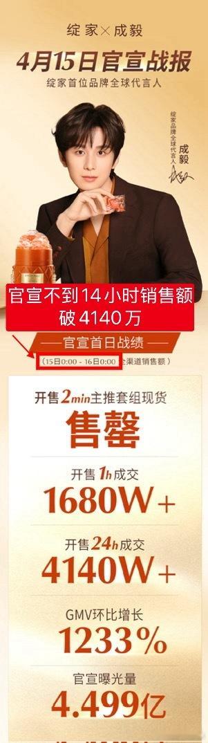 成毅官宣绽家品牌全球代言人首日官方战报出来了(图源绽家官博)!14小时不到销售额破4140万要知道光🍑一个新单链就破了千万,实打实的代言人销售额,开售一小时就破了1680万,光🍑直播间2小时就超2200万,抖2小时499单链就365万了,🐶放图9,每个平台新单链都很牛要知道我全算的代言人新单链所以说这个战报也太干了,实打实的代言人带货成就,牛批!成毅绽家首位品牌全球代言人绽家战报成毅