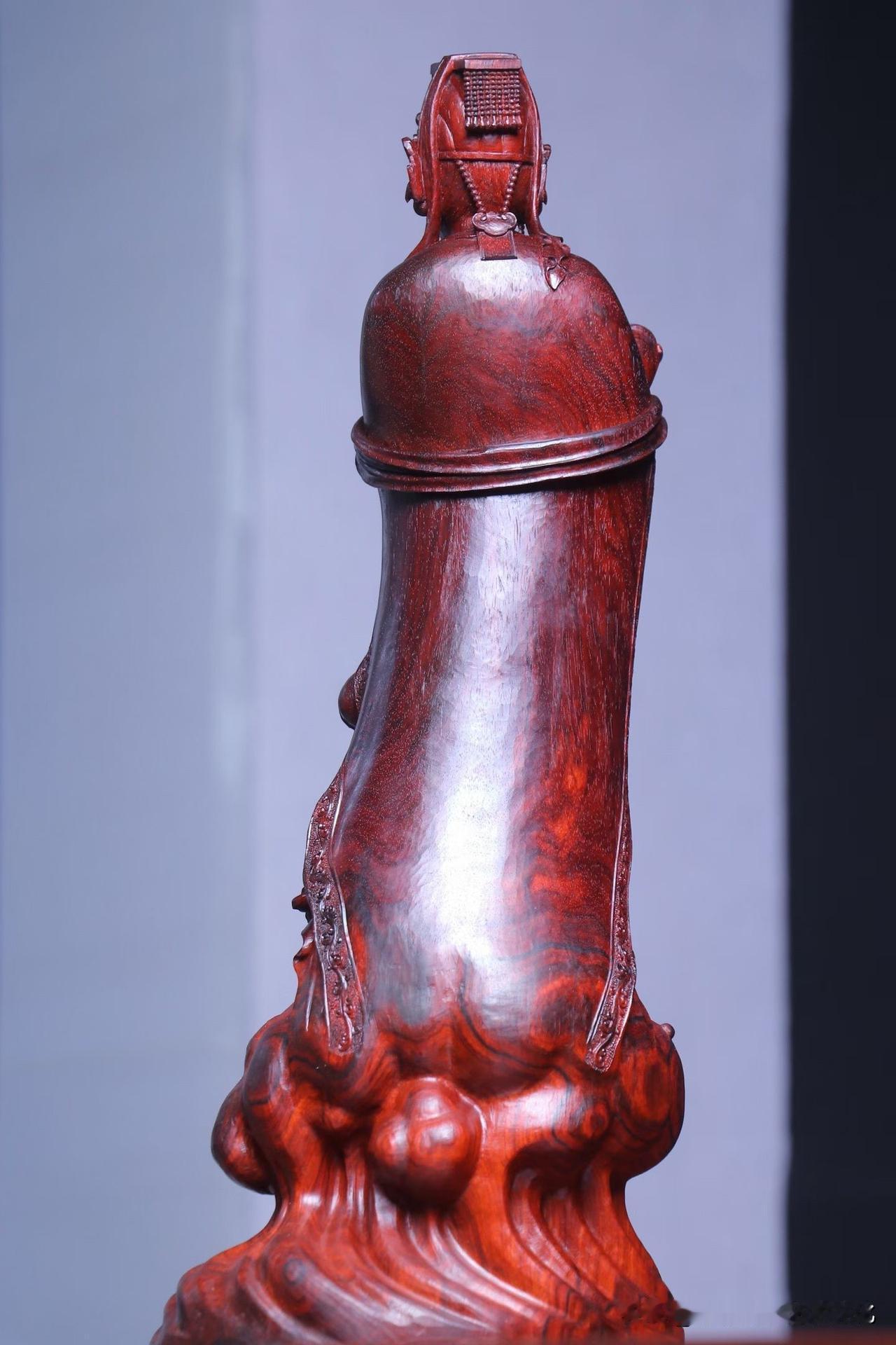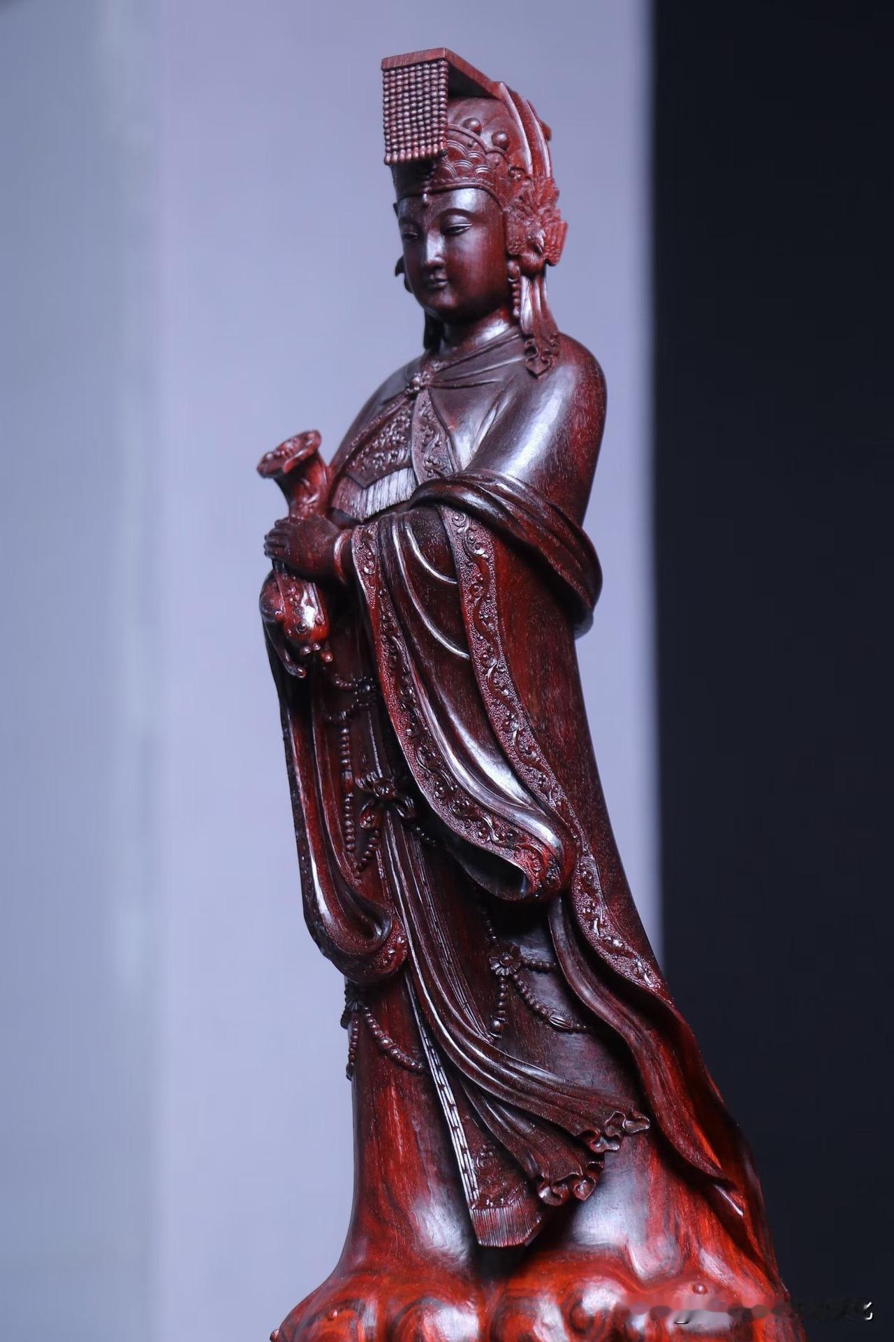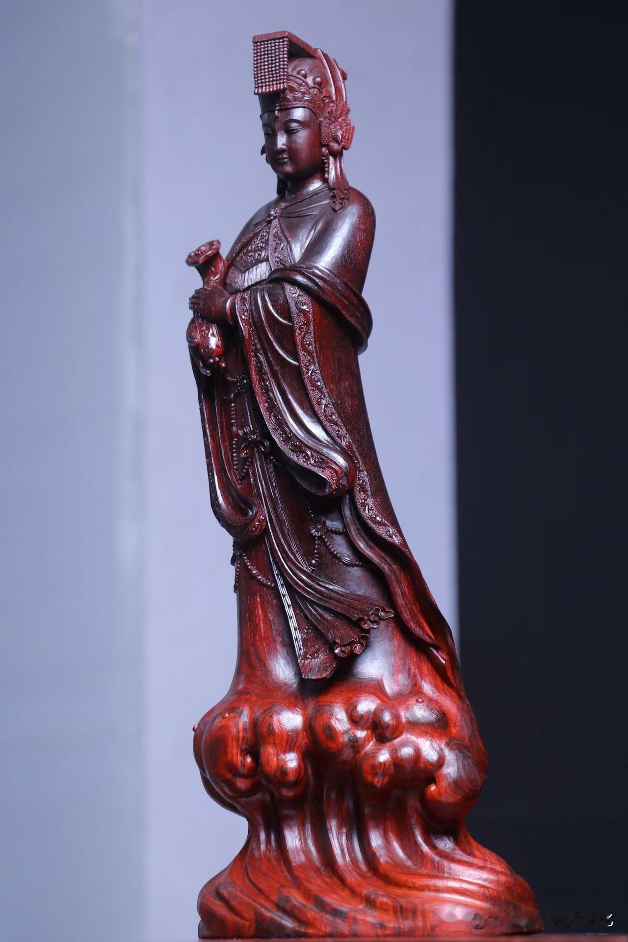 有些守护,是不动声色的。 小叶紫檀的深色像夜海,沉而不压,油润之中带着时间的温度。天妃立于浪上,衣纹翻涌却不乱,线条一收一放,像潮起潮落,自有节律。 她不张扬威仪,只是静静在那里。 手托如意,像在应许什么,又像什么都不必说。 看久了会发现—— 这不是一尊“求”的像, 更像一种“安”。 如果摆在案头,你觉得它更像守护远行, 还是让人安心停下来?紫檀木器 紫檀老料雕刻 高油小叶紫檀 三亚紫檀 紫檀实木家具 帝王紫小叶紫檀 成都紫檀