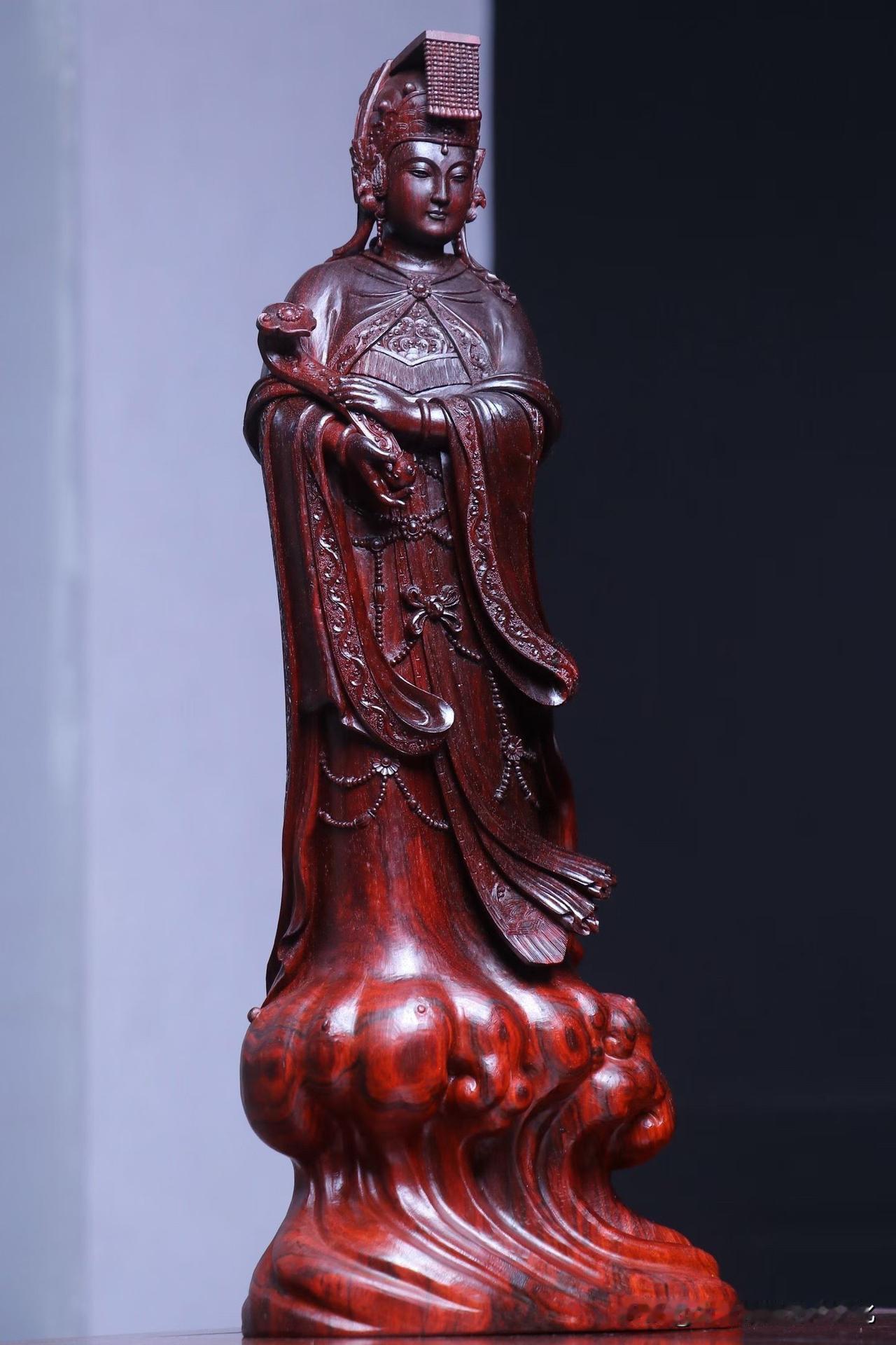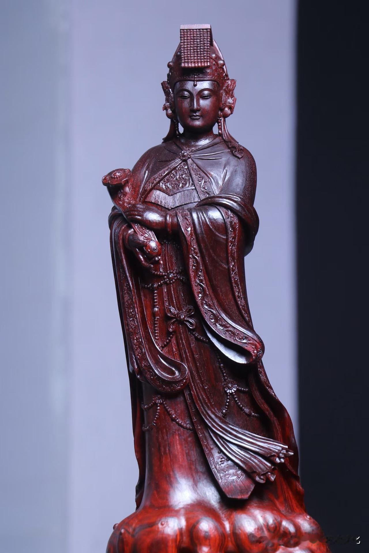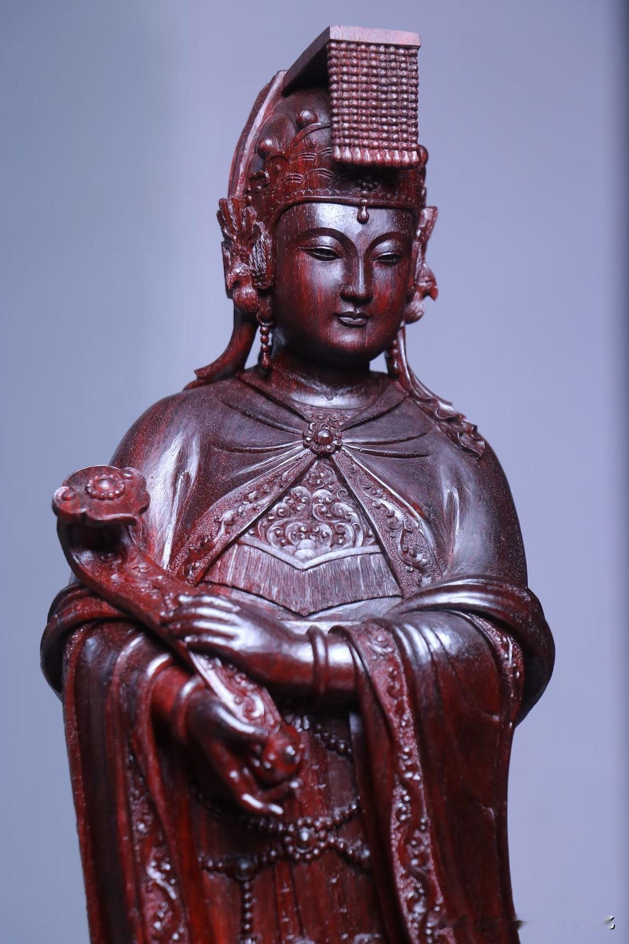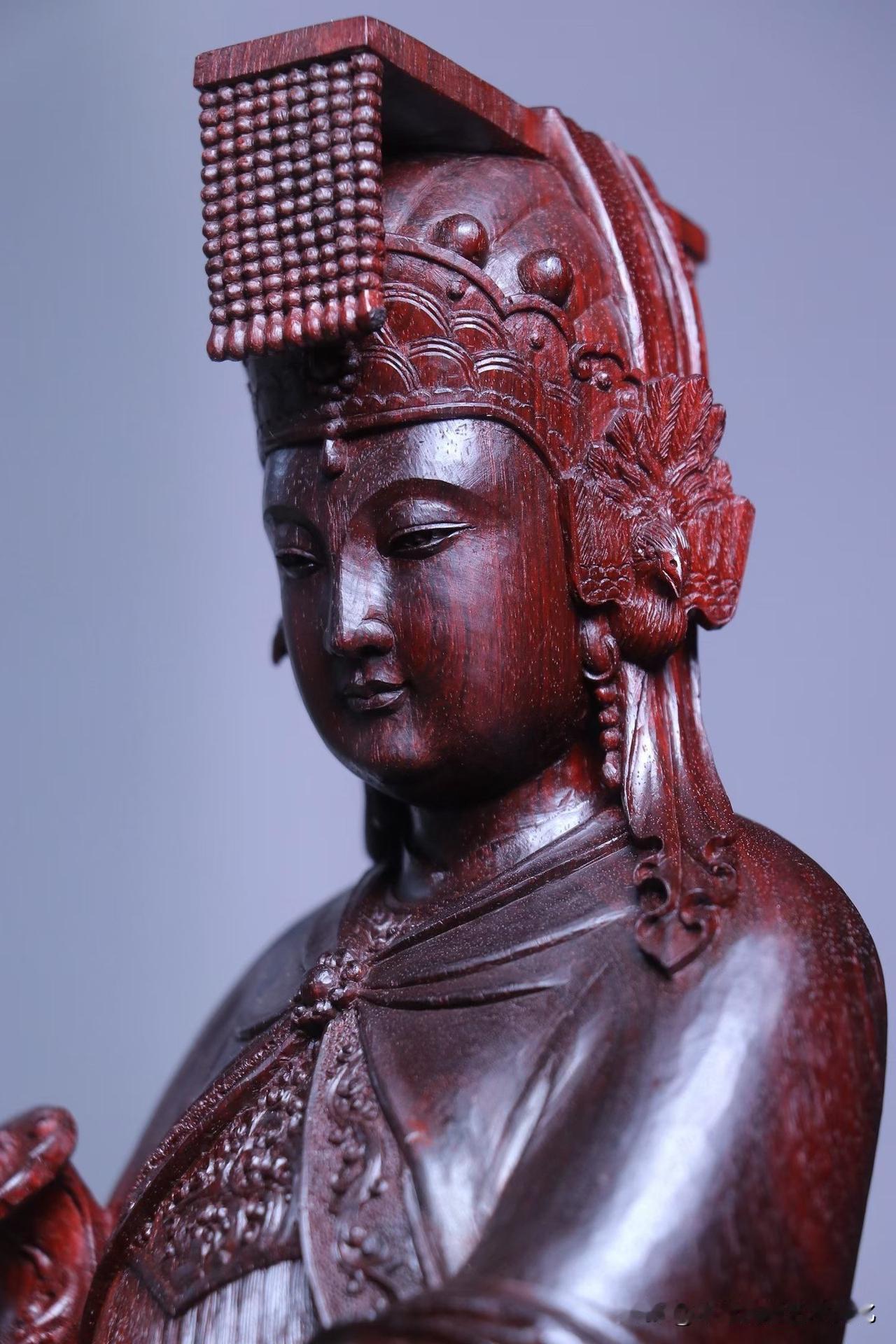有些守护,是不动声色的。 小叶紫檀的深色像夜海,沉而不压,油润之中带着时间的温度。天妃立于浪上,衣纹翻涌却不乱,线条一收一放,像潮起潮落,自有节律。 她不张扬威仪,只是静静在那里。 手托如意,像在应许什么,又像什么都不必说。 看久了会发现—— 这不是一尊“求”的像, 更像一种“安”。 如果摆在案头,你觉得它更像守护远行, 还是让人安心停下来?紫檀木器 紫檀老料雕刻 高油小叶紫檀 三亚紫檀 紫檀实木家具 帝王紫小叶紫檀 成都紫檀