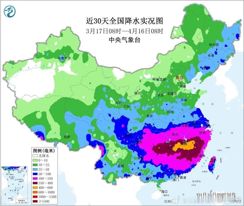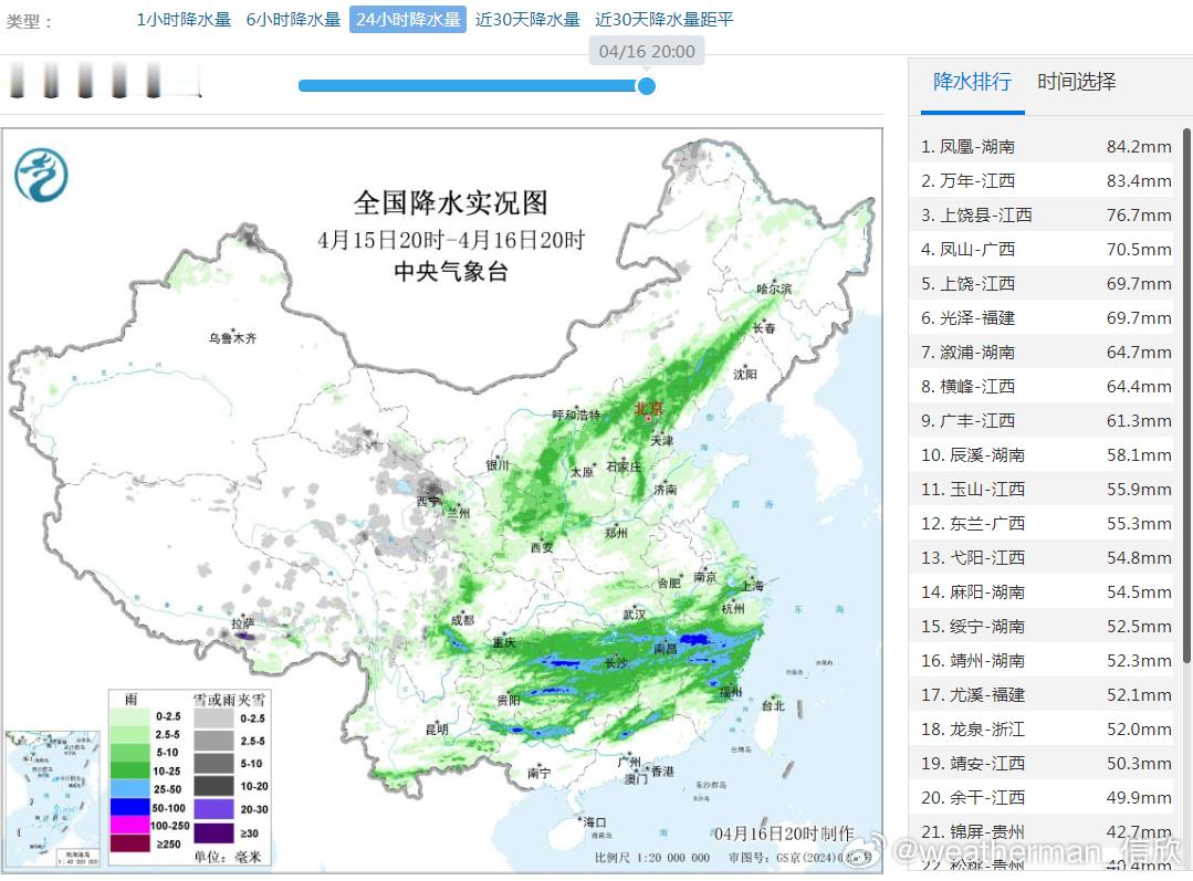 未来2天,随着副热带高压减弱,北方冷空气南下,降雨重心转到华南,今晚中央气象台继续发布暴雨蓝色预警:预计4月16日20时-17日20时,湖南南部、江西南部、浙江南部、福建北部、广西中东部、广东中北部等地有大雨,其中,江西南部、福建东北部、广西中东部、广东西北部部分地区有暴雨。