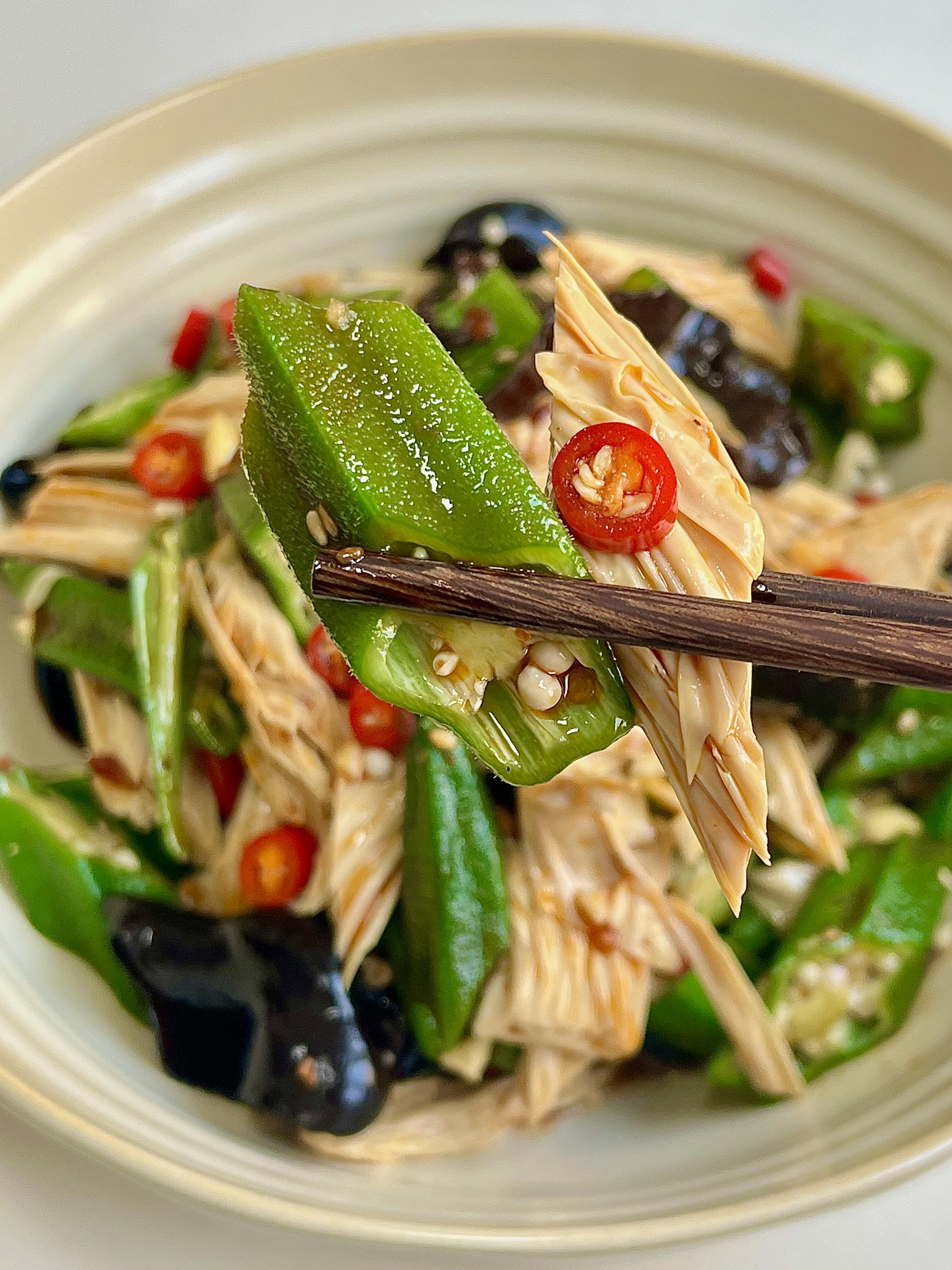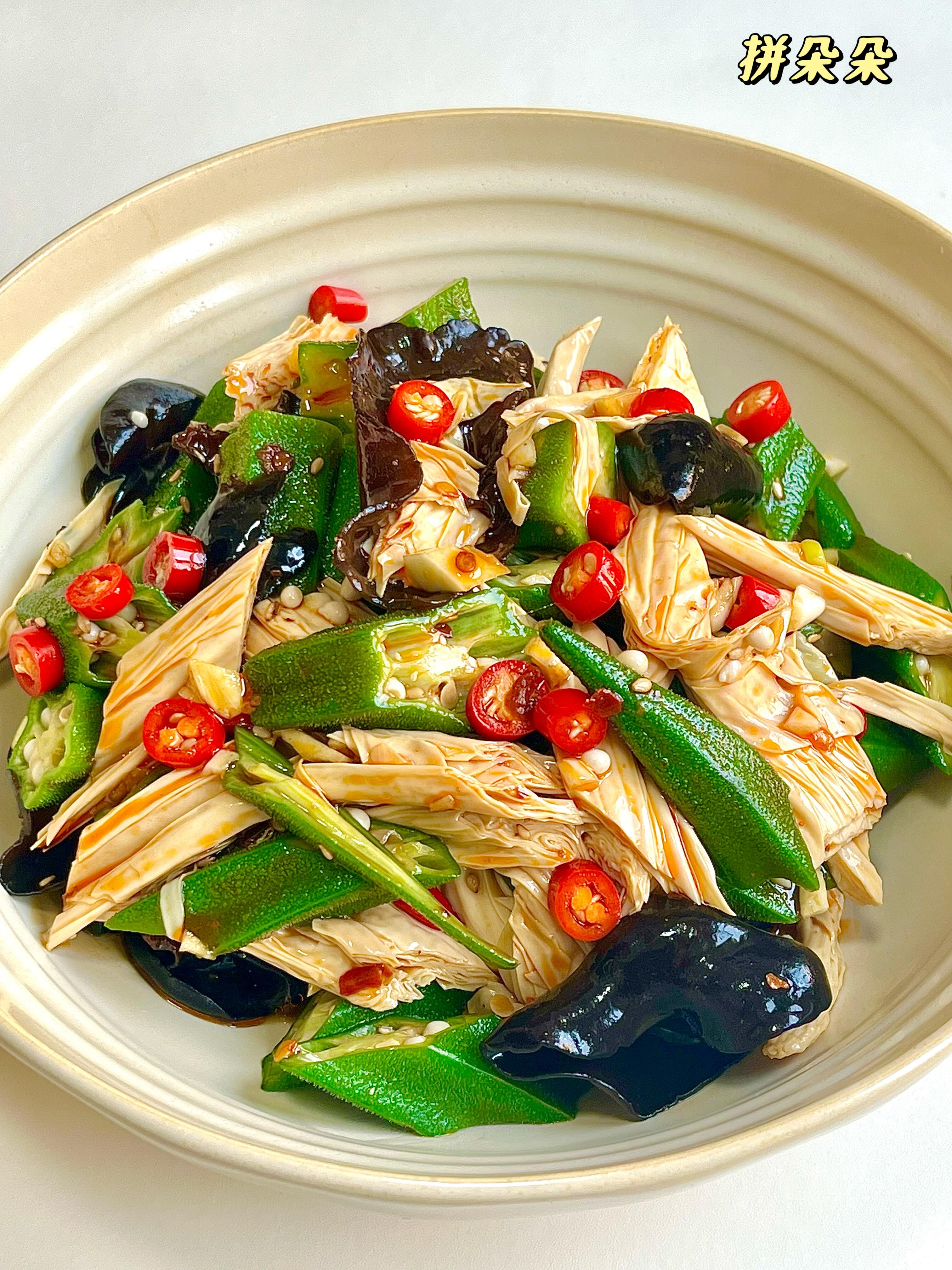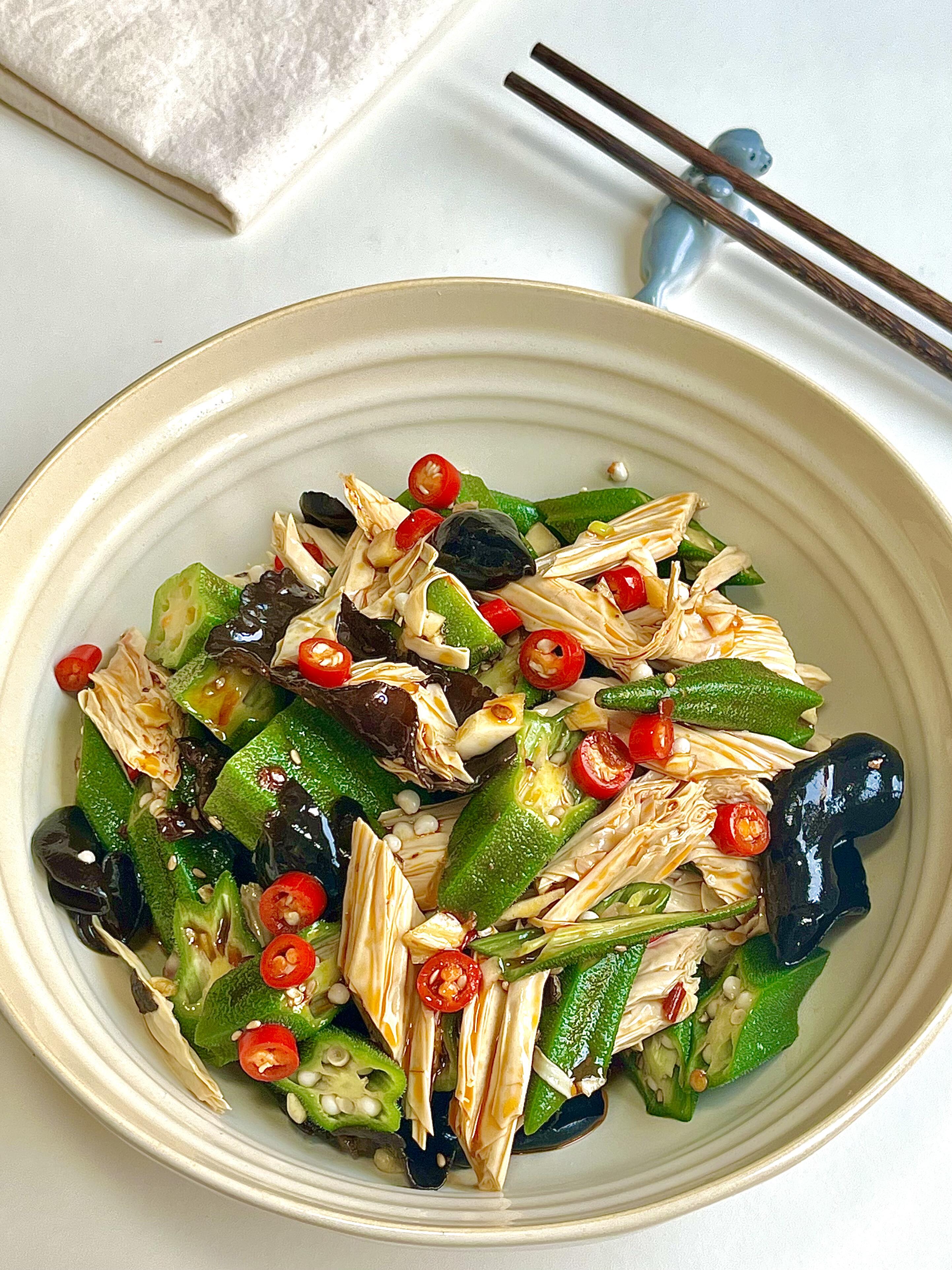 新鲜秋葵脆嫩爆汁,咬一口咯吱作响,搭配Q弹劲道的木耳和软嫩入味的腐竹,口感层次直接拉满✨ 不用复杂烹饪,简单调个料汁,拌匀就能吃,低脂又健康,鲜香味十足。