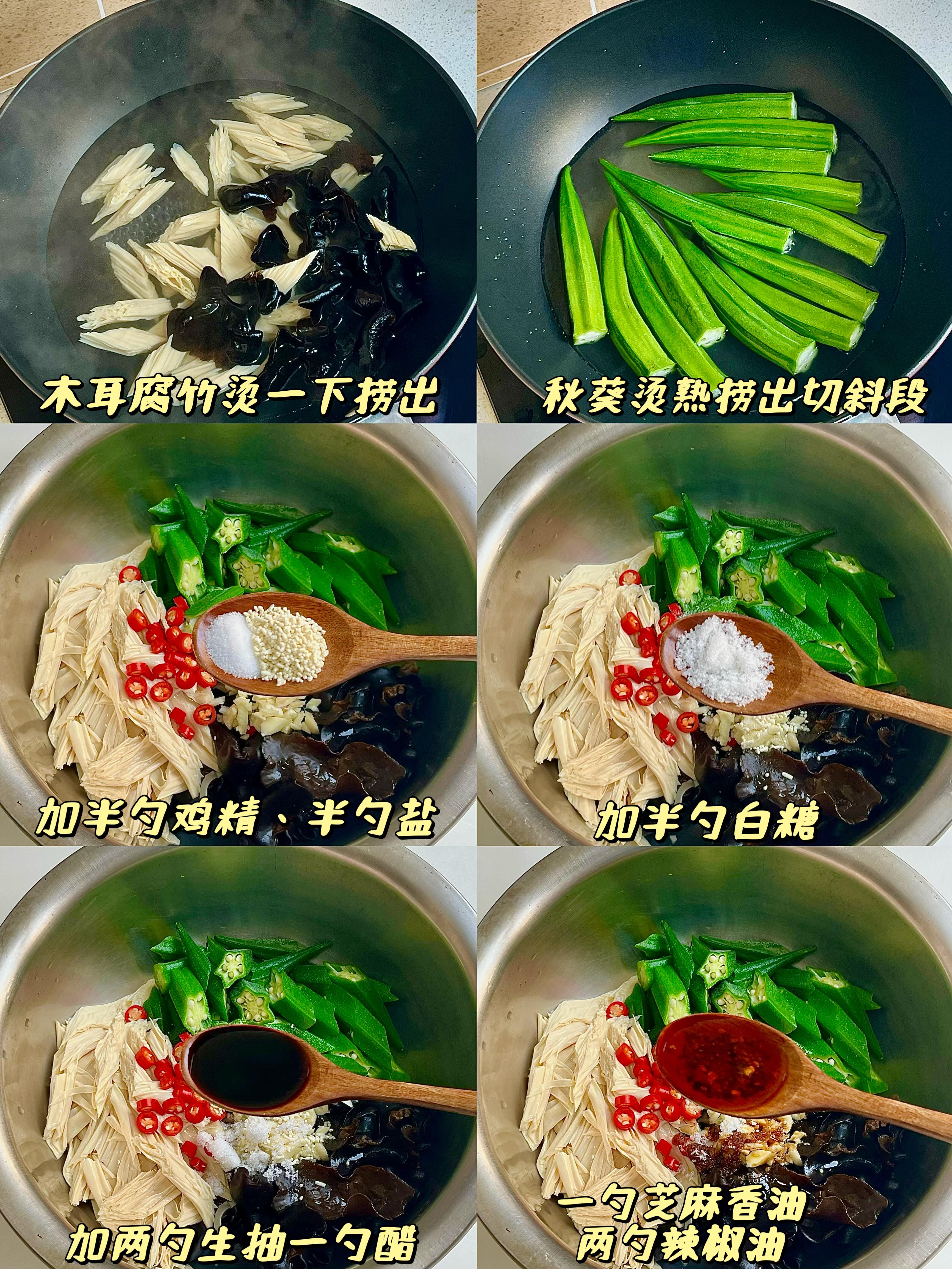 👨🍳秋葵木耳拌腐竹教程,零失败必看: 1️⃣ 提前把腐竹和木耳浸泡一晚,泡发至软;腐竹切成斜刀,秋葵去掉根部,再准备好蒜末和小米辣圈(不吃辣可以省略); 2️⃣ 锅中烧开水,先把腐竹和木耳放进去烫一下,捞出后用凉水投凉沥干;再把秋葵放入沸水中焯水1-1.5分钟,捞出同样投凉,然后切成斜刀; 3️⃣ 把处理好的秋葵、木耳、腐竹全部放进一个大盆里,加入熟芝麻,再依次加半勺盐、半勺鸡精、半勺糖、两勺生抽、一勺醋、一勺芝麻香油、两勺辣椒油; 4️⃣ 所有食材和调料充分拌匀,确保每一根食材都裹满料汁,拌匀后直接装盘,一道清爽解腻的凉拌菜就做好啦!