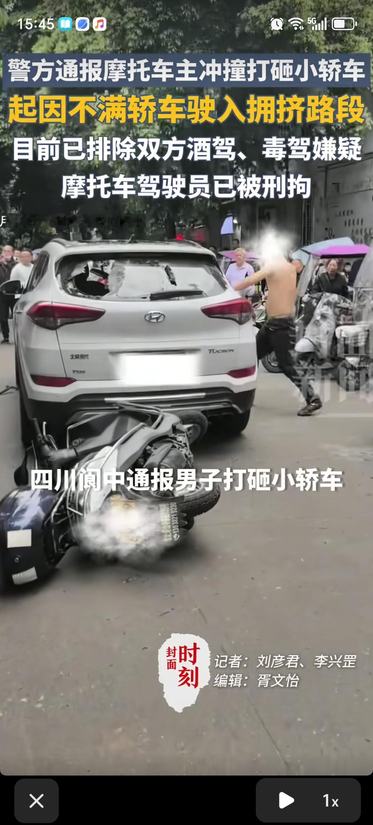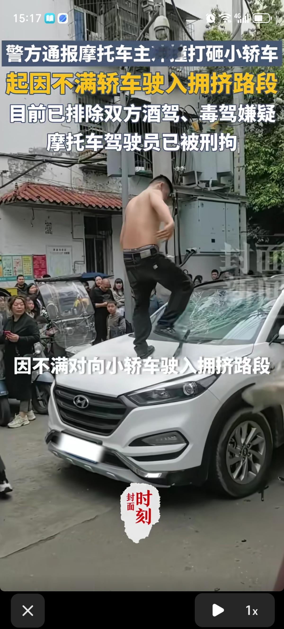 四川阆中一个骑摩托车的光膀汉子发现一辆小轿车偏偏在放学高峰期出来挡路,一时气愤,就开始对小轿车拳打脚踢。把轿车四周的玻璃砸碎不算,还跳上了车顶,一通用脚踩,踩哪里碎哪里。 轿车车主全程不敢出来,车主可能是来接孩子的,也可能是不认识路,偏偏选在了放学高峰期,又偏偏选择了古城区这条特别狭窄的小巷,又运气不好的碰到了一个暴脾气的大哥,都没人敢拦那种。 从车被破坏的程度来看,买一辆新车要比修车更有性价比。好在摩托车汉子最后被控制住了,解救了瑟瑟发抖的轿车车主。