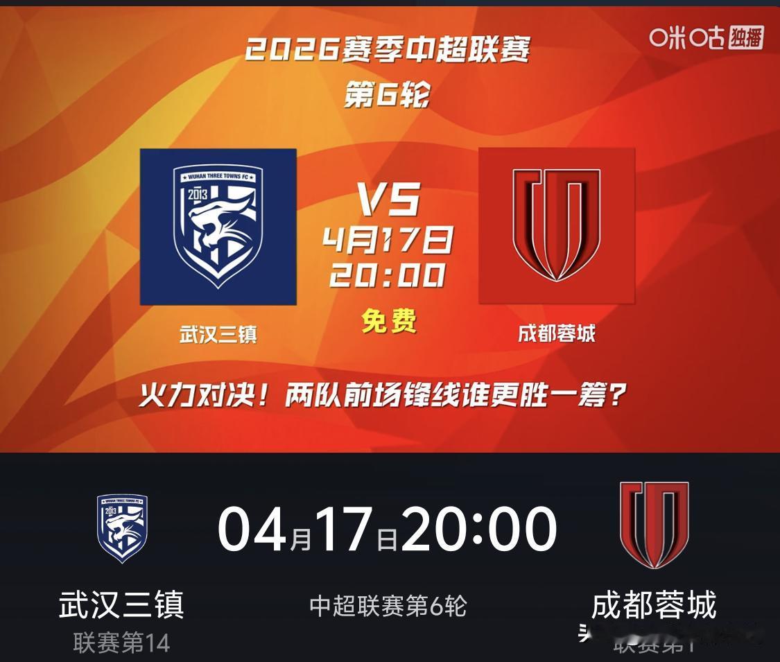 4月17日周五晚8点,武汉三镇主场迎战攻击力强劲的榜首球队成都蓉城。目前球队遭遇三轮不胜,此战无疑十分艰难。好消息是,五外援均可出战,全员出击全力一搏。 值得一提的是,武汉三镇自2019年中乙至今,主场对阵成都蓉城保持不败,但多次交手均以平局收场,始终未能取胜。在五外援加持下,球队能否捍卫主场荣耀,终结这一平局怪圈?本场比赛咪咕将免费直播,让我们拭目以待!中超 武汉三镇队 成都蓉城队 📊 历史主场交锋详情 2023-05-19:武汉三镇 3-3 成都蓉城2024-07-20:武汉三镇 1-1 成都蓉城2025-06-29:武汉三镇 2-2 成都蓉城2019 中乙:武汉三镇 0-0 成都蓉