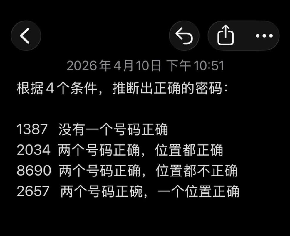 根据4个条件,你能推断出正确的密码吗? 1387 没有一个号码正确 2034 两个号码正确,位置都正确 8690 两个号码正确,位置都不正确 2657 两个号码正碗,一个位置正确