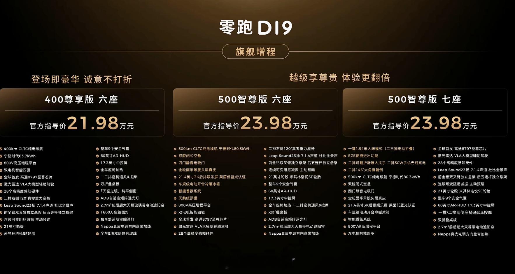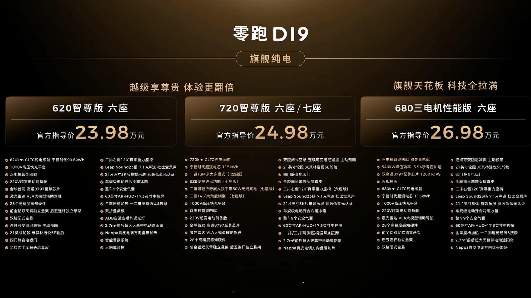 零跑D19发布了,这价格特别炸裂,是其他9系车差不多一半的价格。而且电池还是最大的,价格区间是21.98-26.98万