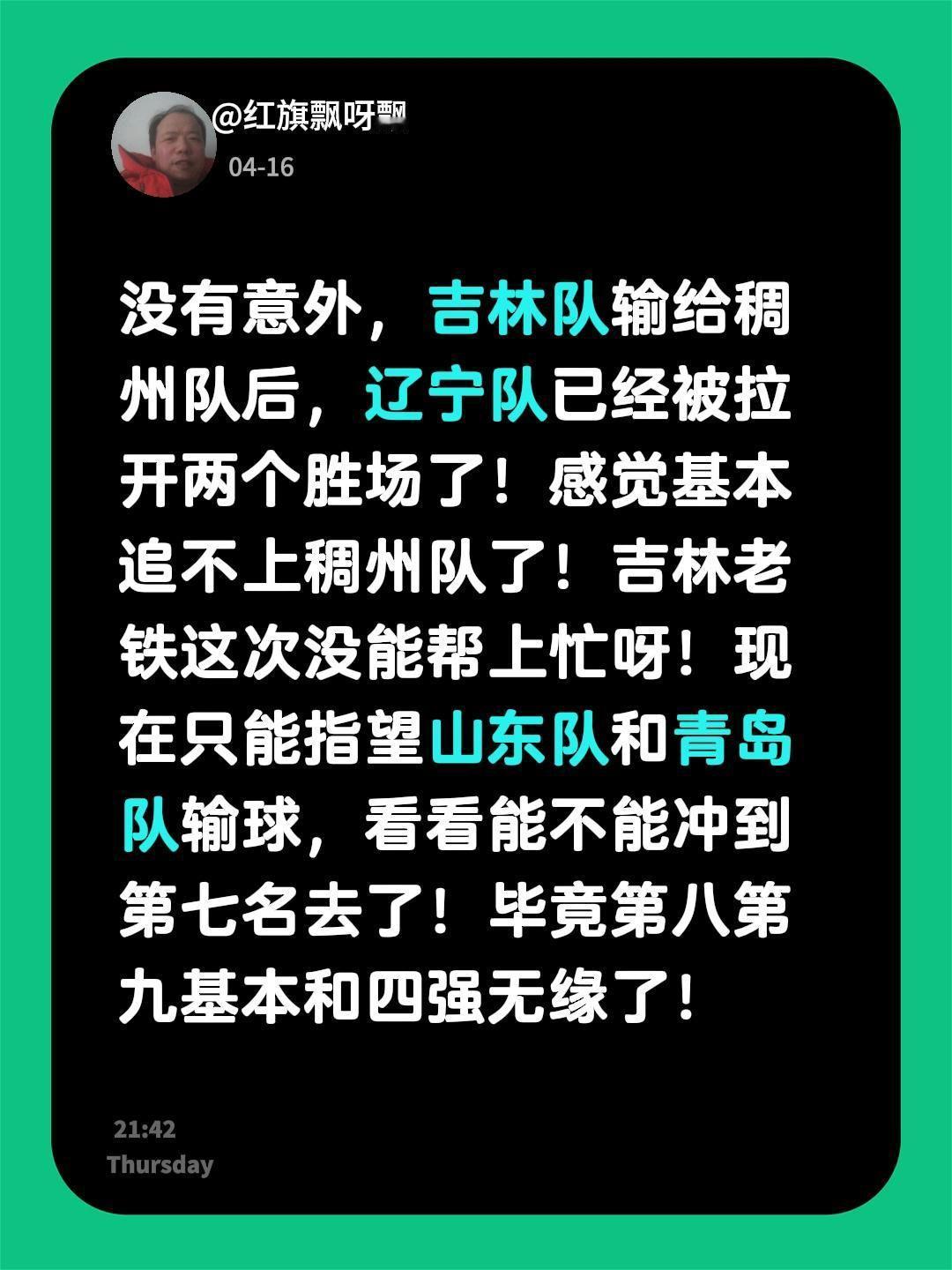 吉林老铁没有帮到辽宁队呀!没有意外,吉林队输给稠州队后,辽宁队已经被拉开两个胜场了!感觉基本追不上稠州队了!吉林老铁这次没能帮上忙呀!现在只能指望山东队和青岛队输球,看看能不能冲到第七名去了!毕竟第八第九基本和四强无缘了!上热门 cba热门 辽宁男篮 山东男篮