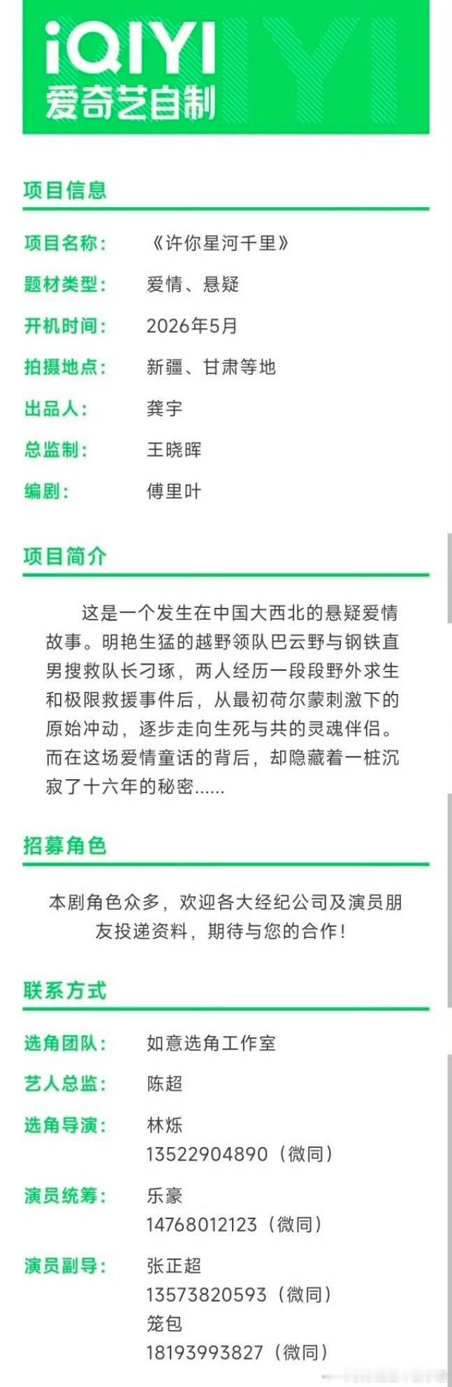 电视剧《许你星河千里》:丞磊、沈羽洁出品:爱奇艺、恒星引力开机时间:2026年5月27日