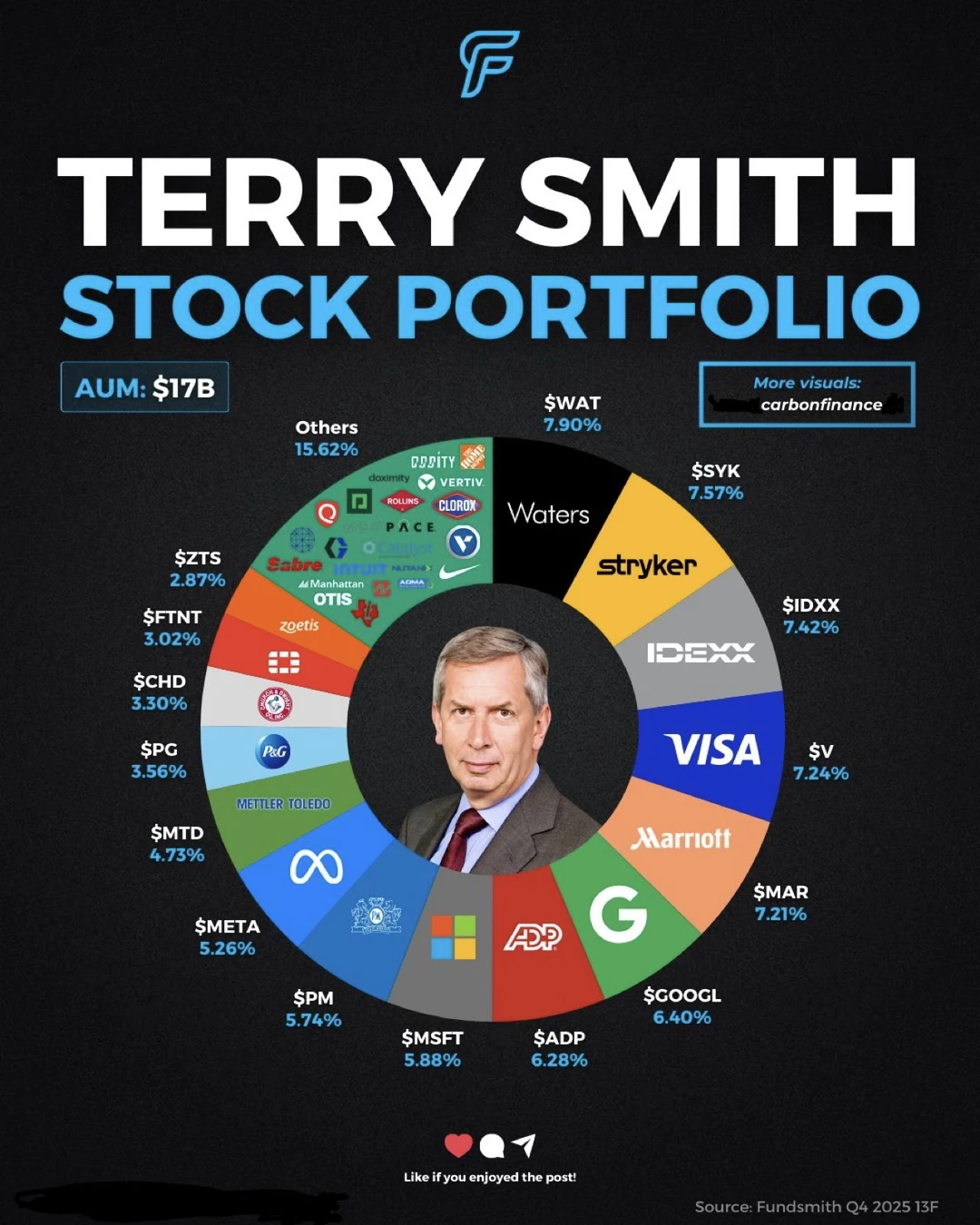 这是英国传奇投资人Terry Smith的投资组合拆解,截至2025年四季度,管理规模约170亿美元,展示了他最核心的长期持仓结构。