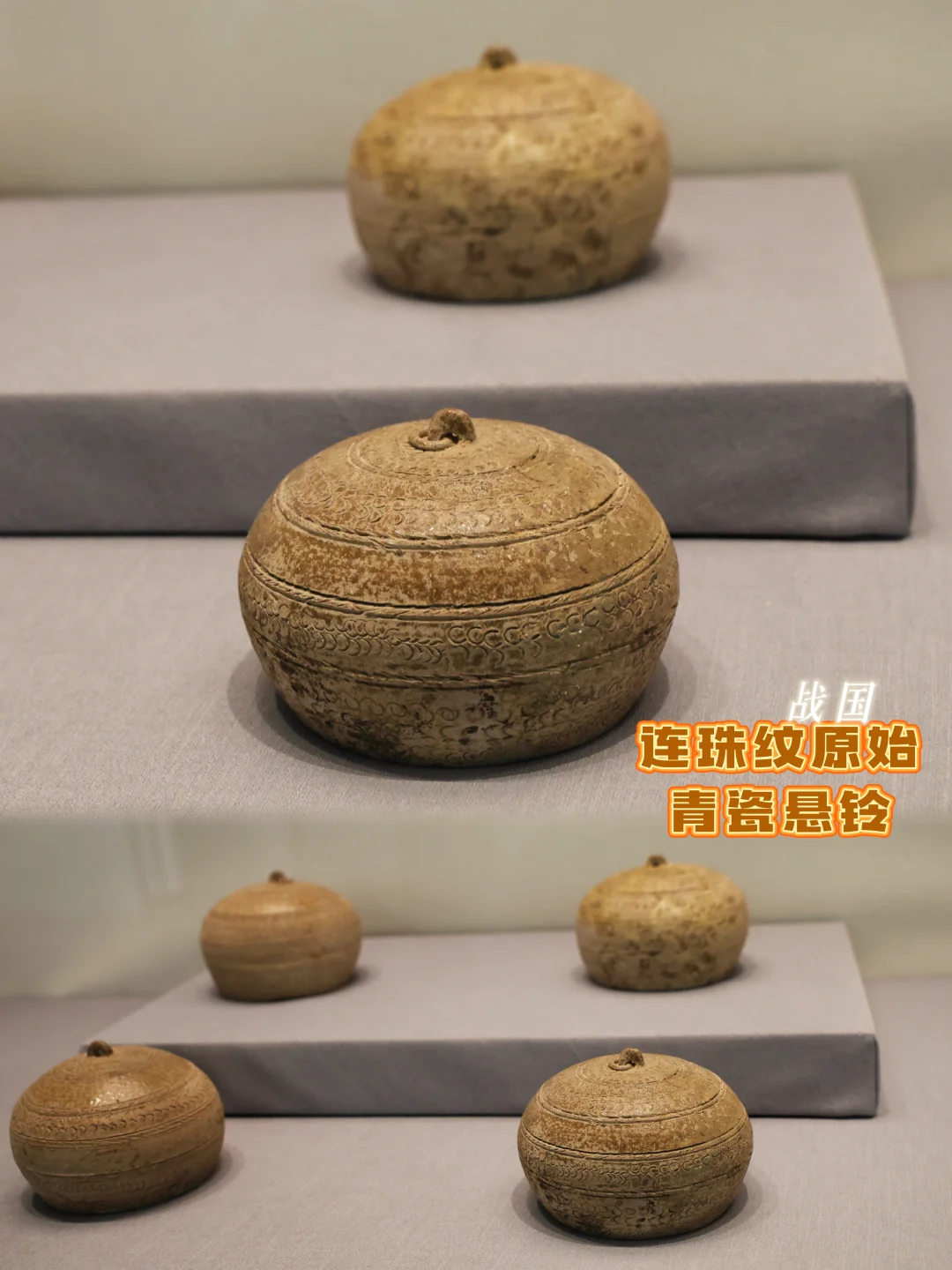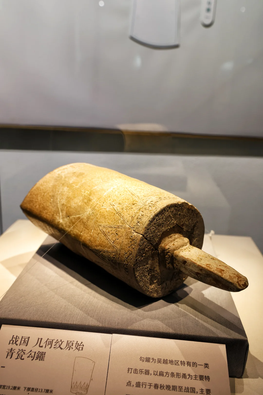 这可是吴越地区特有的打击乐器!扁方条形的甬身,刻满了灵动的几何纹,仿佛能听见两千多年前,吴越先民敲击出的古乐余音,是原始青瓷里的“活化石”,藏着吴地最早的礼乐风华。