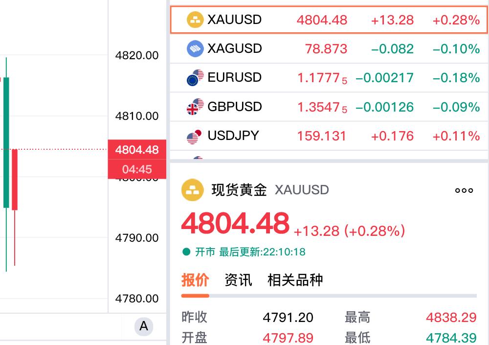 好消息, 现货黄金探底回升, 重回四千八百美元上方。 虽然刚刚现货黄金 最低跌至4784.39美元, 但是回落的快,反弹也很快。 现货黄金重回四千八上方, 现货黄金报价4804.48美元, 再度翻红。 对于现货黄金, 期货小褚还是坚持看涨观点不变!