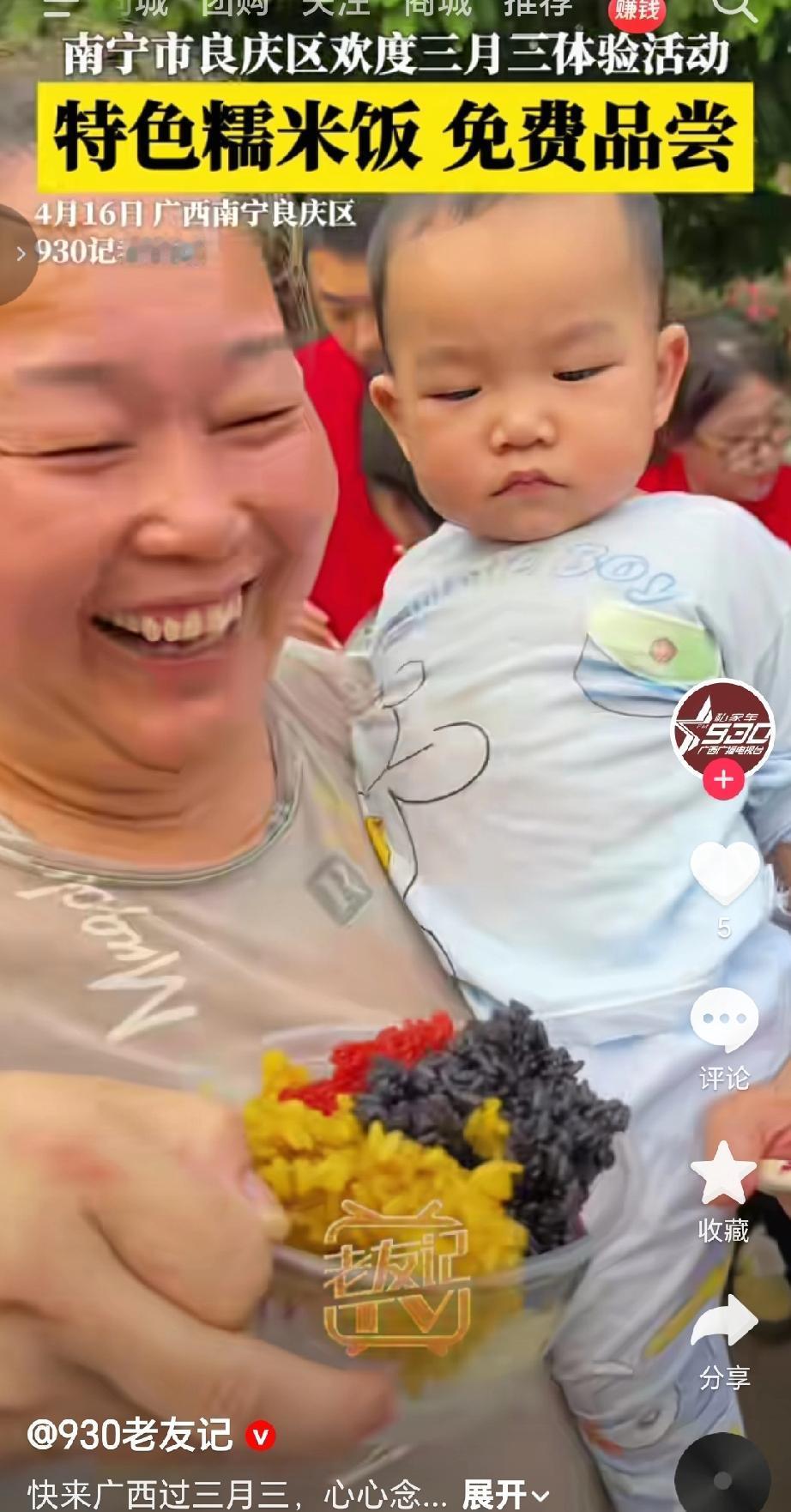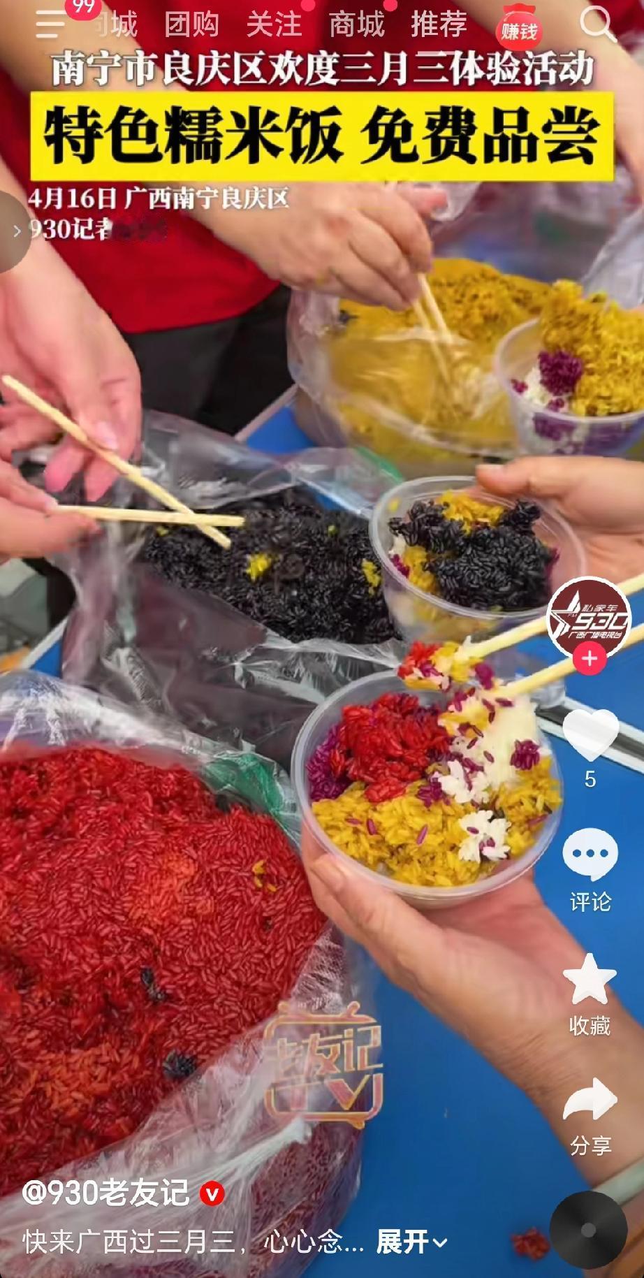 4月16南宁良庆区欢度三月三体验活动,市民可以免费品尝特色糯米饭,了解制作糯米饭的植物染料等。(来源于@930老友记 )