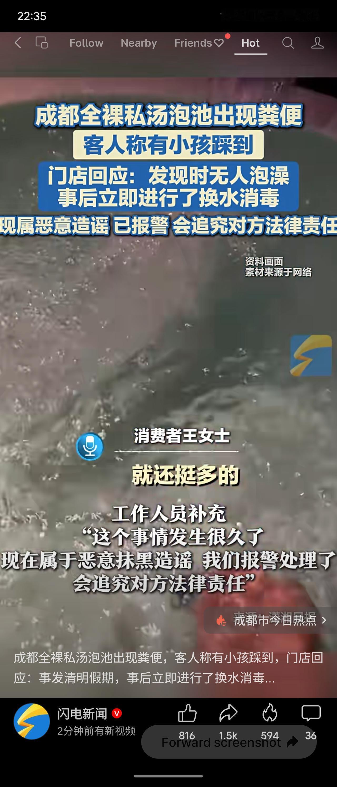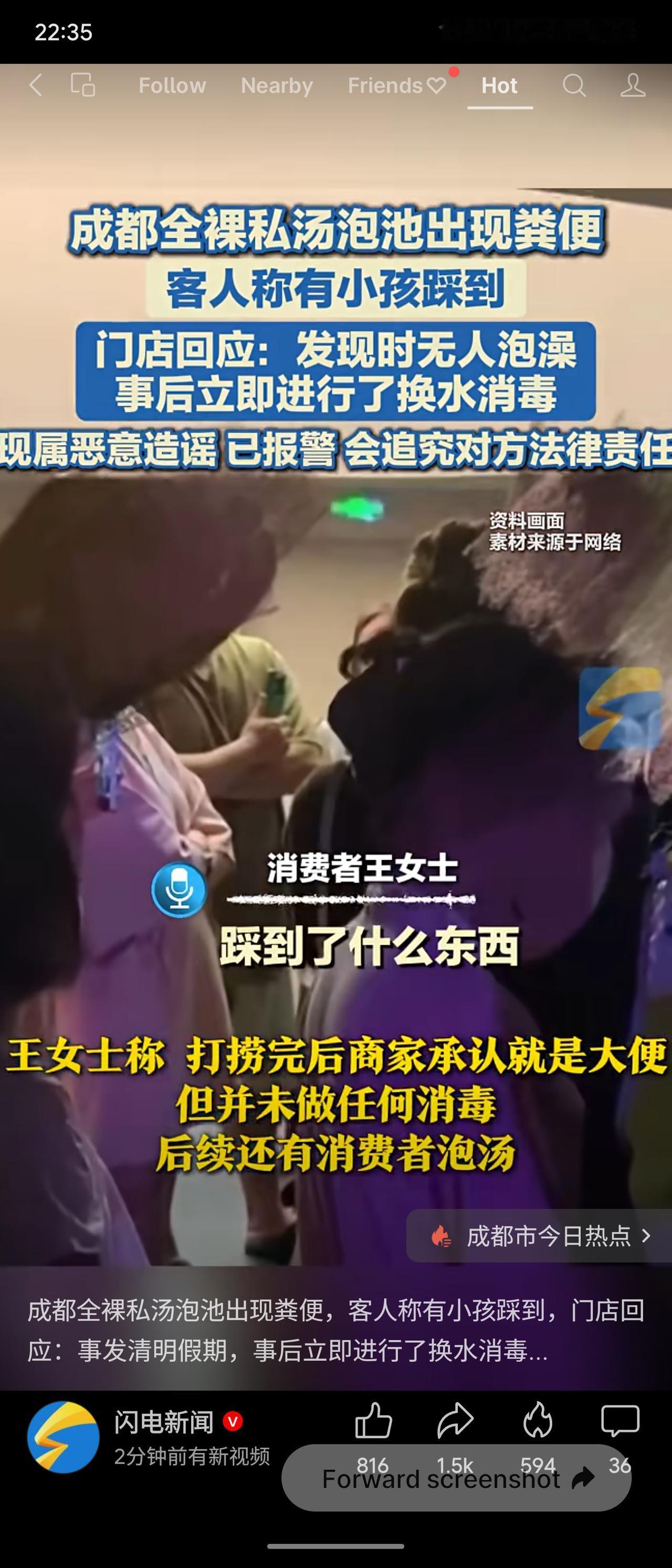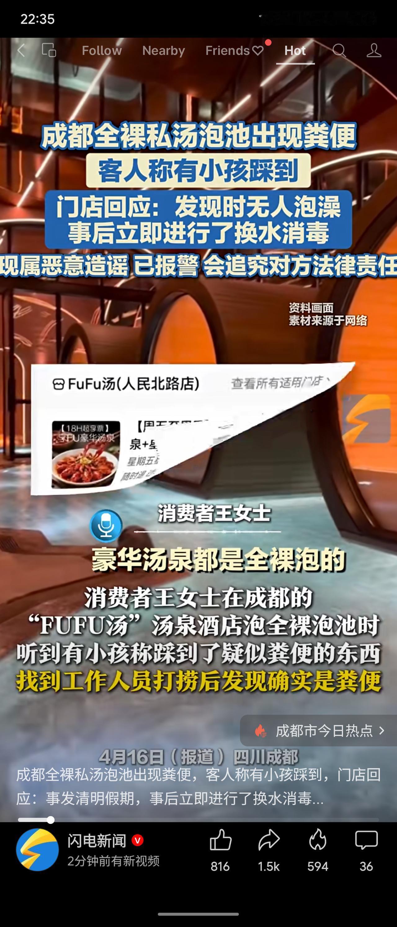 成都“FUFU汤”全裸私汤泡池被曝出现粪便,有小孩踩到,消费者打捞确认。门店称事发清明假期,当时无人泡澡,事后已换水消毒,并指对方恶意造谣,已报警追究责任。但消费者表示商家未及时消毒,后续仍有客人泡汤。 公共汤泉卫生安全至关重要,即便无人泡澡,出现粪便也应及时彻底处理并致歉,而非简单推责“造谣”。双方说法矛盾,建议监管部门介入查清事实,给消费者一个交代。