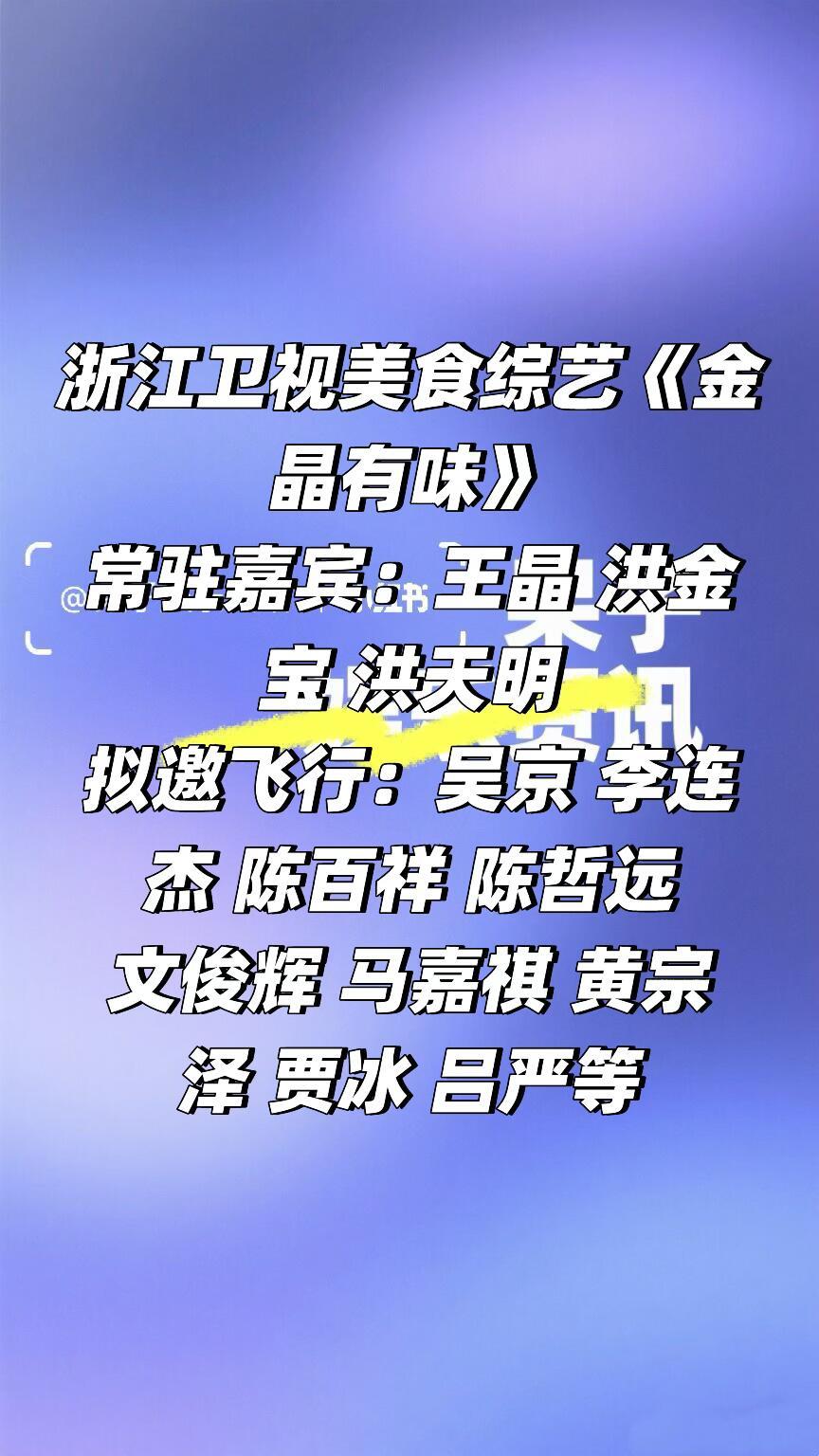 浙江卫视美食综艺《金晶有味》阵容浙江卫视美食综艺《金晶有味》常驻嘉宾:王晶 洪金宝 洪天明拟邀飞行:吴京 李连杰 陈哲远 文俊辉 马嘉祺 黄宗泽 贾冰 吕严等