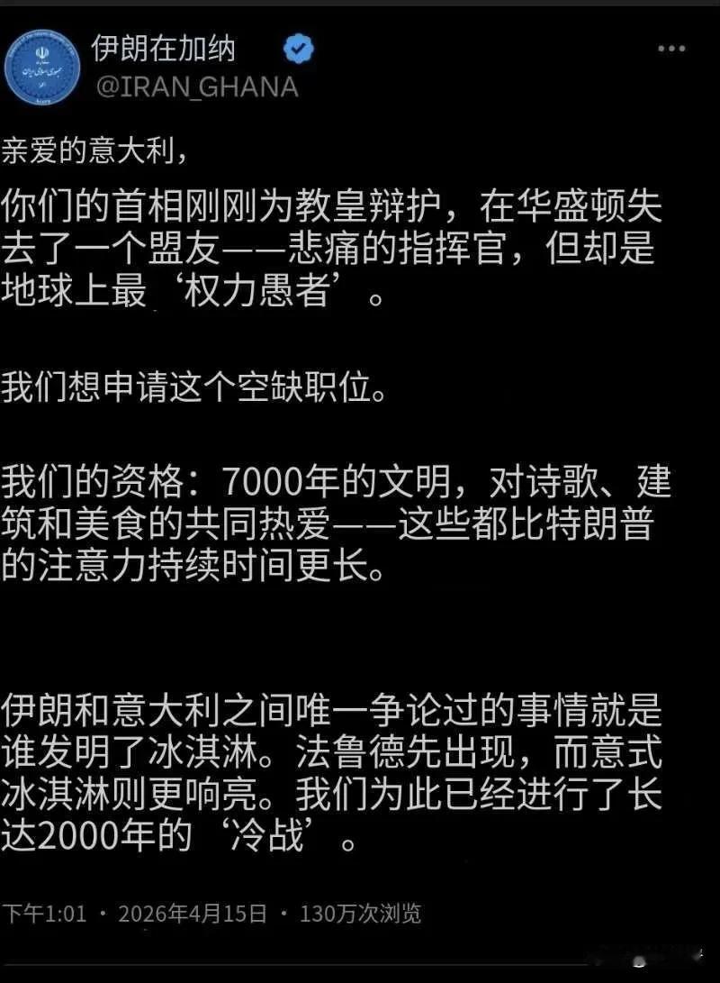 看见意大利美女总理跟老川普闹翻,伊朗的战讽局决定放下2000年的冷战仇怨,伸出友谊之手…… 可是我看完了他们的说法,觉得我们有权利参加他们这场冷战! 嗯,我是说关于冰激凌的事。 中国古籍记载从汉代开始,我们的老祖宗就已经研究用奶酪牛奶还有蜂蜜加上冬天保存下来的冰搅和进稀粥了…… 怎么样?我们参战不?[呲牙][呲牙][呲牙][呲牙]