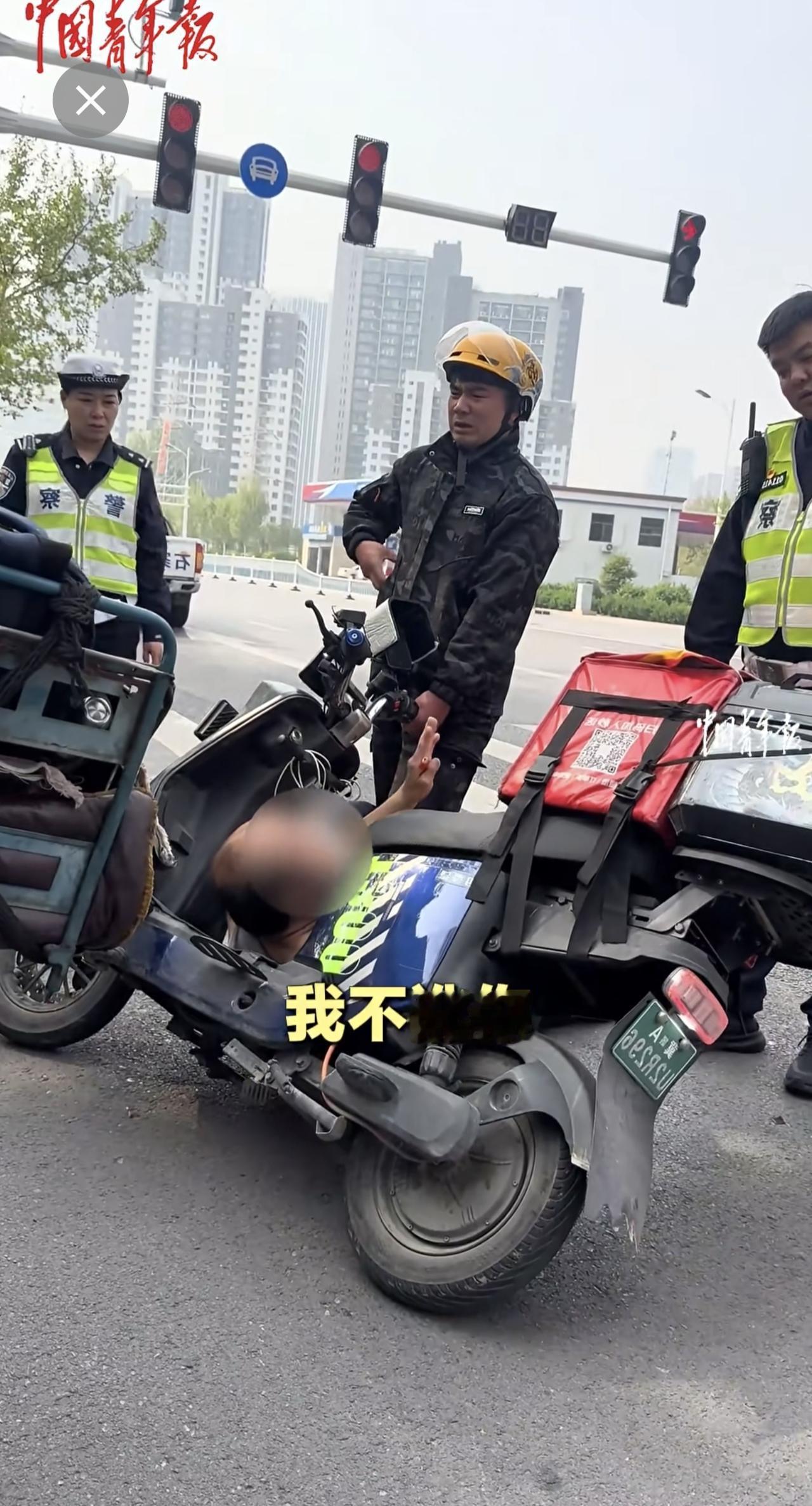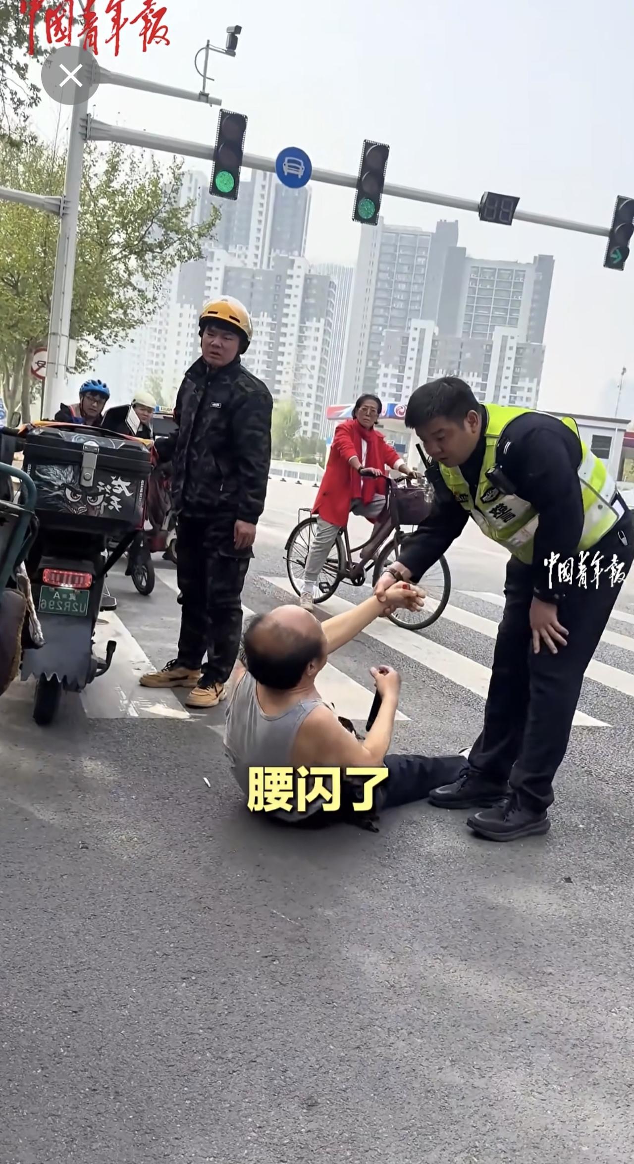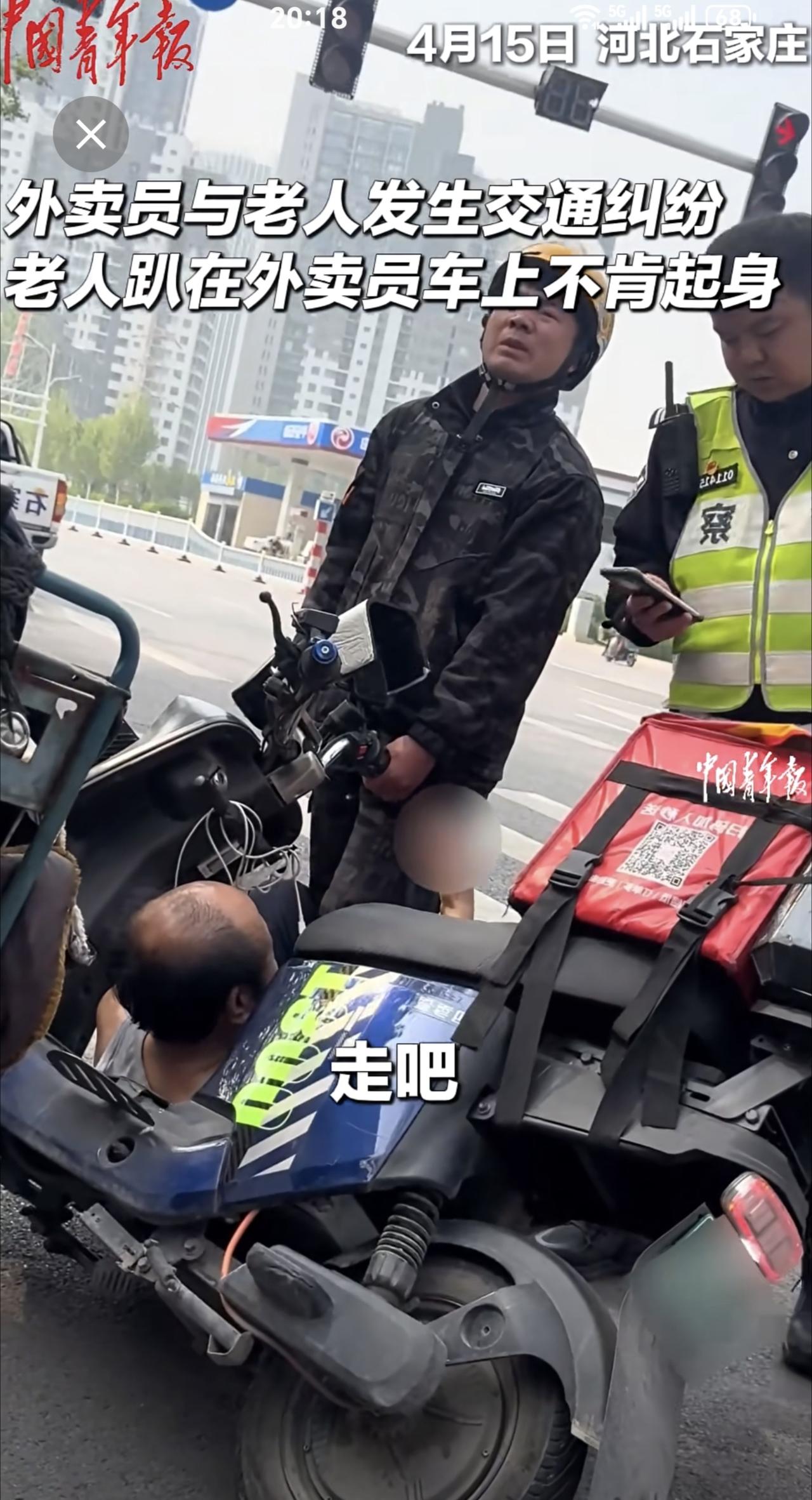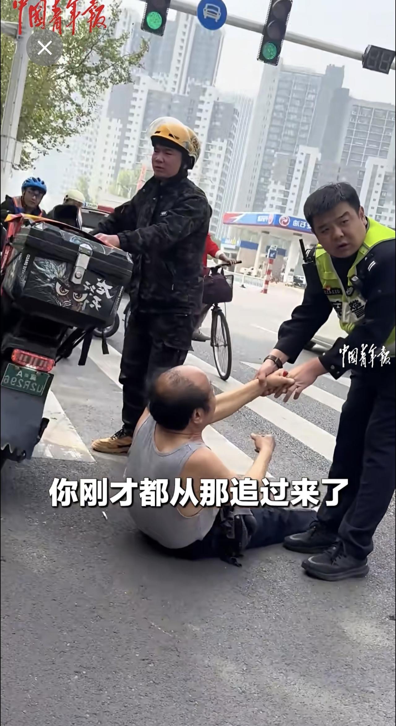 外卖员与老人发生交通纠纷,交警协调后帮外卖员向老人支付赔偿。 (来源:中国青年