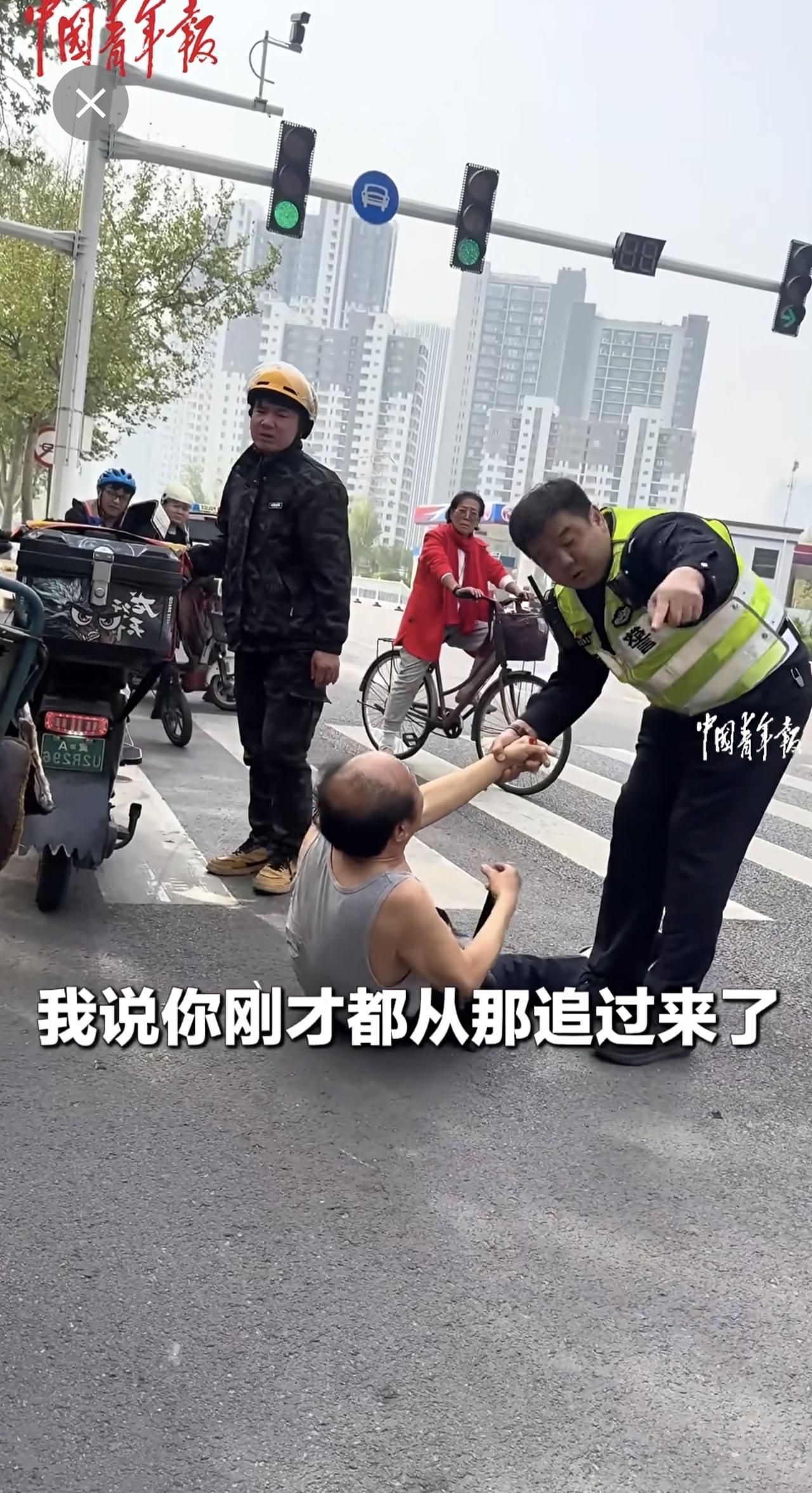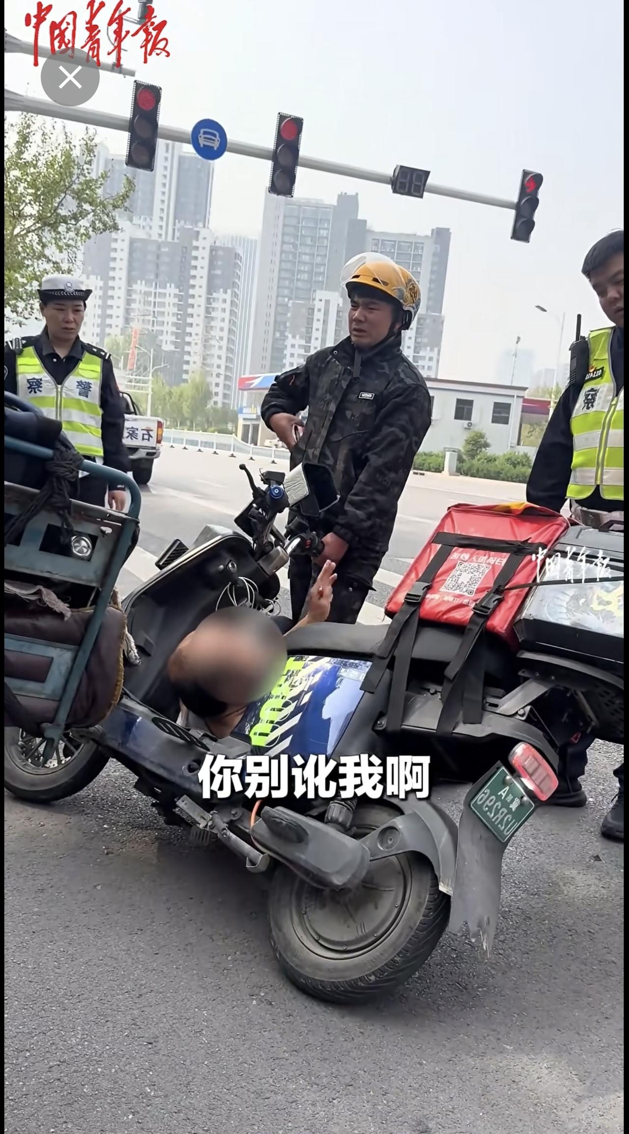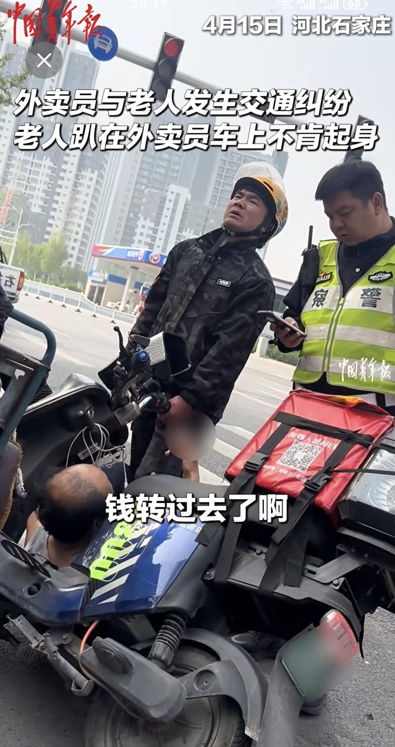 外卖员与老人发生交通纠纷,交警协调后帮外卖员向老人支付赔偿。(来源:中国青年