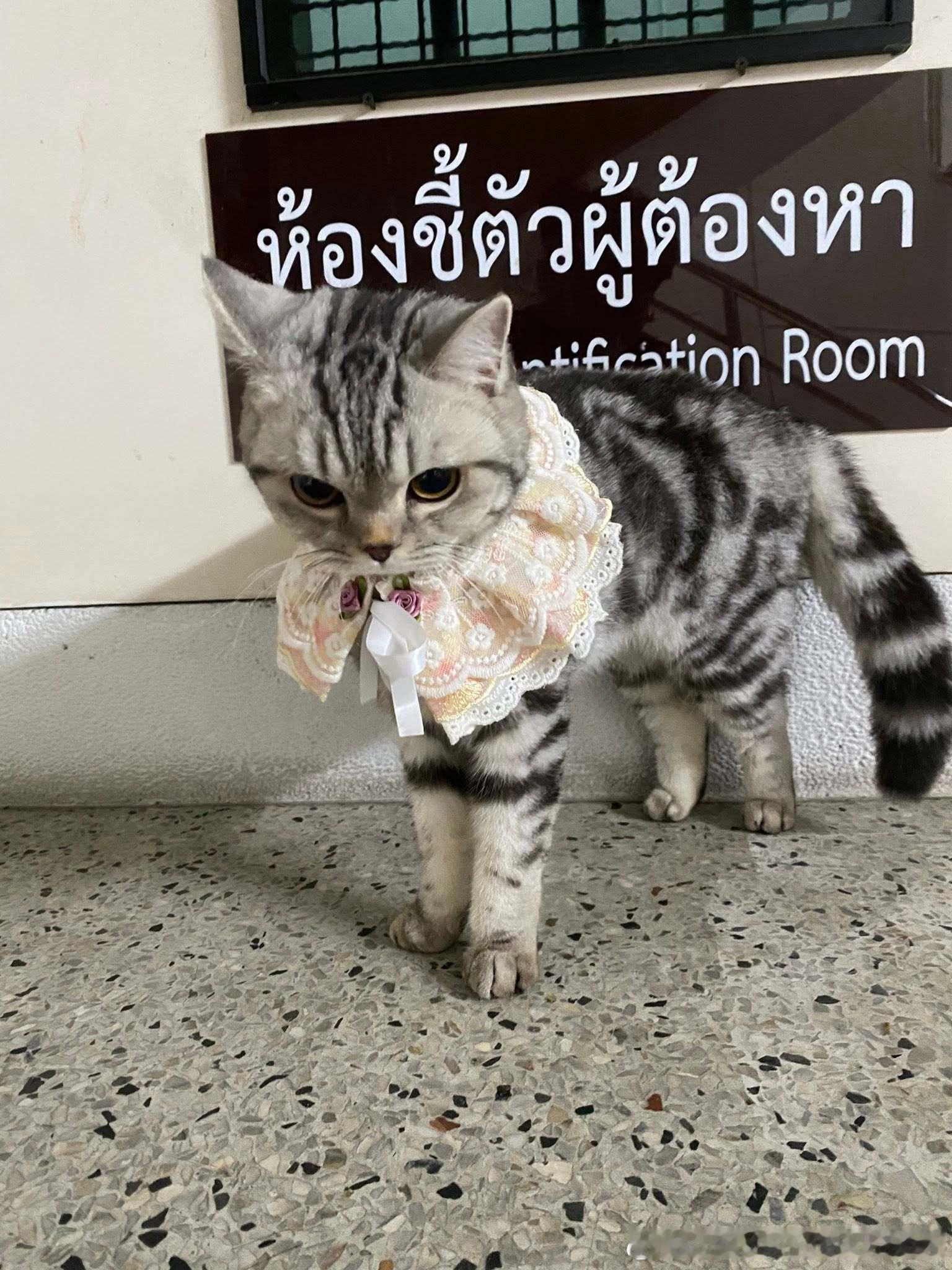 这只走失的美国短毛猫名叫Nub Tang(泰语意为“数钱”),它因为在警察局“袭警”而走红网络。