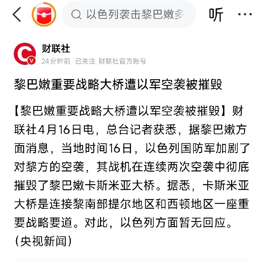 突发!以军炸断黎巴嫩战略大桥,中东战火再升级!这5只标的直接受益! 财联社4月16日电,当地时间16日,以军战机两波空袭,彻底炸断黎巴嫩卡斯米亚大桥——连接南部提尔与西顿的最后一条跨河命脉。黎南15万平民被彻底孤立,真主党补给线全断,中东地缘风暴直接拉满! 战火一烧,市场避险情绪直接爆表!原油、黄金、军工、油运四大主线全线异动,资金疯狂涌入! 核心受益标的(5只) 1. 中国海油(600938):海上油气龙头,油价暴涨最受益,业绩弹性最大。 2. 中远海能(600026):全球VLCC油运龙头,中东航线占比高,运价随时跳涨。 3. 赤峰黄金(600988):黄金弹性之王,乱世避险首选,金价一涨就疯。 4. 航天彩虹(002389):察打一体无人机龙头,中东订单爆满,实战刚需。 5. 宝丰能源(600989):甲醇龙头,伊朗供给收缩,国内替代直接受益 。 投资必警:地缘冲突瞬息万变,停火谈判、局势缓和均会引发市场剧烈波动,以上仅为事件梳理,不构成投资建议。