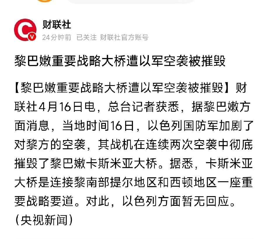 突发!以军炸断黎巴嫩命脉大桥,中东战火彻底烧穿,地缘风暴再升级! 当地时间4月16日,以色列战机直接下死手,两波空袭彻底炸塌黎巴嫩卡斯米亚战略大桥,不给半点回旋余地! 这座桥可不是普通通路,是连接黎南部提尔、西顿的核心命脉,也是当地最后一条跨河主干通道,之前以军已经炸断多座桥梁,现在直接把这条路彻底封死。 这一手太狠了,直接把黎南部彻底孤立,武装补给、平民出行、人道物资全断了,当地十几万平民直接陷入绝境,人道危机直接拉满! 明眼人都看得出来,以色列这是要把战事彻底升级,原本的局部冲突越打越凶,中东地缘局势彻底失控,避险情绪直接爆表! 后续局势只会更紧张,原油、黄金、军工板块随时再迎异动,这场战火带来的连锁反应,才刚刚开始! 投资必警:地缘冲突突发多变,局势缓和、停火谈判均会引发市场剧烈波动,以上仅为局势分析,不构成投资建议。
