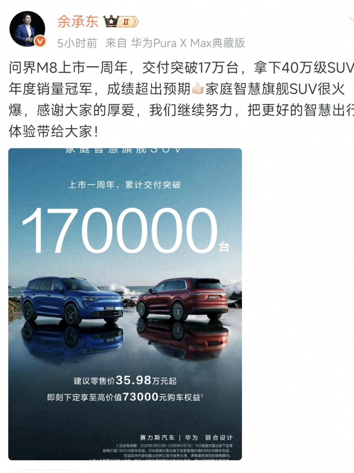 一天之内,余承东公布两个好消息 1,易烊千玺成华为pura90系全球代言人 2,问界M8交付突破17万台 我觉得华为现在越来越稳了,从手机到鸿蒙智行,全是行业教科书级的王炸。 就拿刚刚发布的畅享90系列来说,整个市场已经抢疯了,1299起到顶配512GB的pro max,作为对比,友商目前拿不出一台同级抗衡,其他厂商还因为内存零部件上涨而涨价时,华为还偏偏反其道而行之,512的90 pro max国补下来多多1开头,说句难听的,这是不留活路了。 马上要发布的Pura90系列,基本上也是碾压局,据说处理器有9020,9030,还有9030 pro,加上2亿长焦,第二代红枫,大电池,鸿蒙6...基本是把短板全给堵死了,预测价格也会很惊喜,总之,以华为的厚道,想卖不好都难。 另外问界M8是真的逆天,上市一年下来,销量直接17万+,这可是均价40万的车子,坐稳同级SUV年度销冠,碾压BBA豪华市场,近半车主都是豪华品牌置换,用硬核销量改写行业格局,配置还给了王炸,华为ADS,智能座舱,硬核品质和严苛标准下的产品力,这车也是想不卖好都难。期待接下来的发布会了。