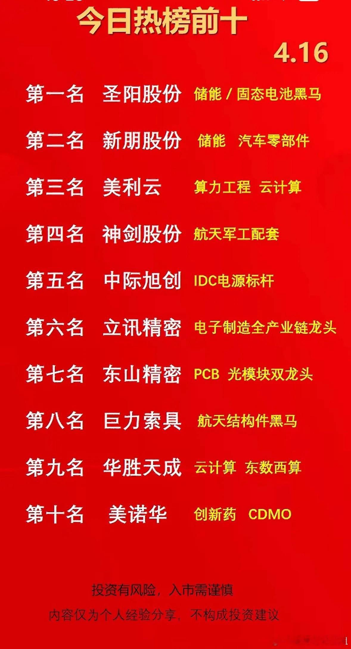 4月16日周四今日热榜前十大股票,投资需谨慎!