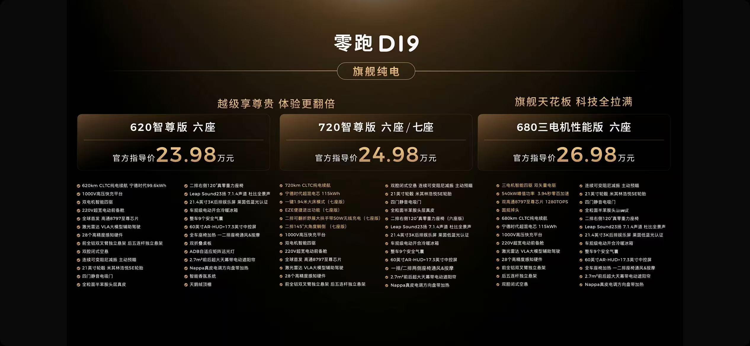 零跑d19 纯电版 23.98 万起,比增程贵一点,全系宁德时代 99.6kWh 电池 / 115kWh 电池,起步 620km 续航,还有三电机版本。