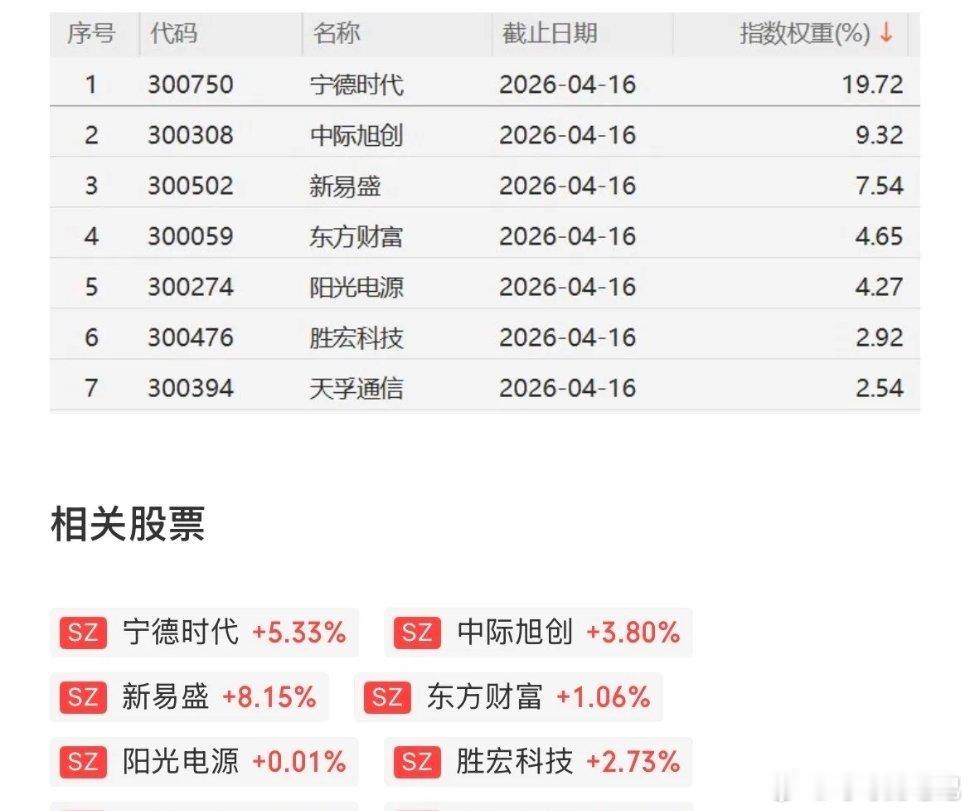 创业板里面,单单宁德时代、“易中天”三家,胜宏科技(PCB概念)、东方财富、阳光电源,其中宁德时代占据19.7%的份额,“易中天”占据19.4%的份额,这也就为什么,创业板这么强了,今年的主线CPO大涨,创业板涨,宁德时代新能源、锂电池大涨,创业板涨,手握创业板就是手握新能源和AI算力了。