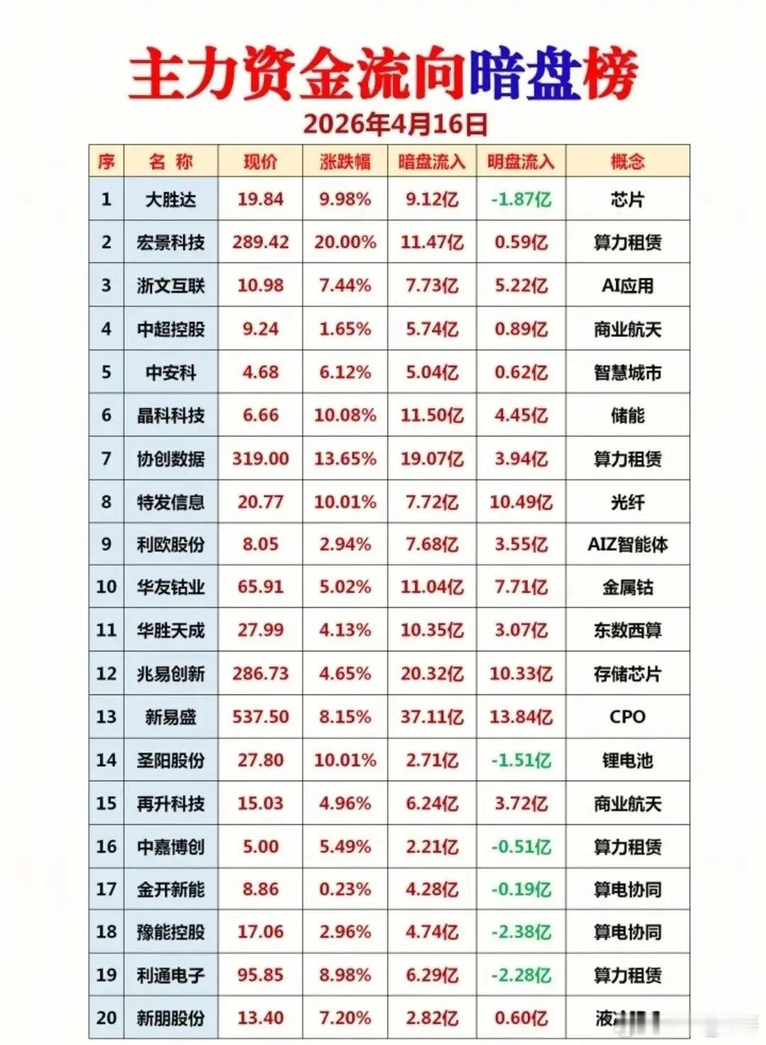 尾盘抢筹榜里,新易盛、中际旭创、协创数据等光模块与算力标的持续获资金追捧,暗盘资金也在算力租赁、存储芯片方向大幅流入,市场对AI主线的信心显著回升。