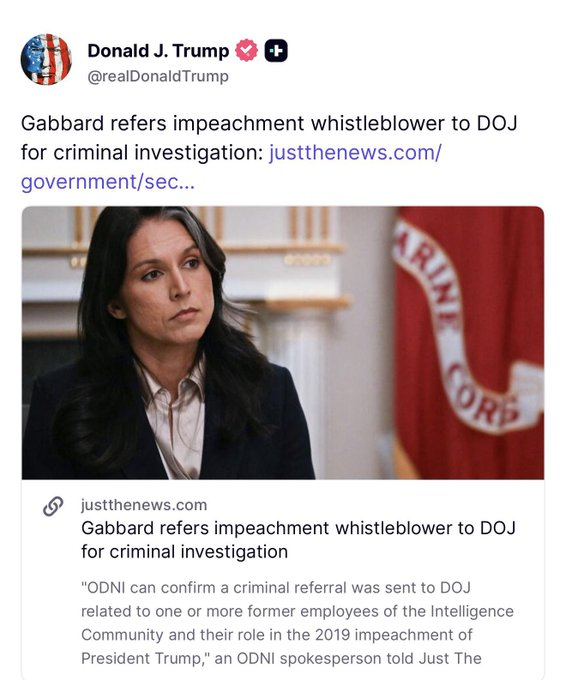 Tulsi Gabbard just referred the dirty 2019 impeachment “whistleblower” to the DOJ for criminal investigation.