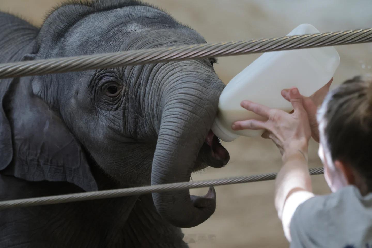 美国首都史密森国家动物园来了新成员,一个2个月大的亚洲象Linh Mai。附图是动物园饲养员给小象喂配方营养剂。网图