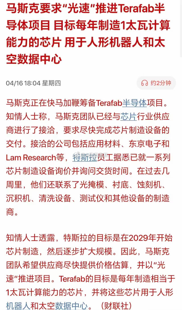 家人们,今晚这条重磅消息直接点燃半导体赛道!据财联社4月16日报道,马斯克正以“光速”推进Terafab半导体项目,团队已密集接洽光掩模、衬底、蚀刻机、沉积机、清洗设备、测试仪等全链条供应商,要求快速报价与优先交付。目标更惊人:年产能达1太瓦算力芯片,相当于当前全球芯片年总算力产能的50倍,主攻人形机器人与太空数据中心。