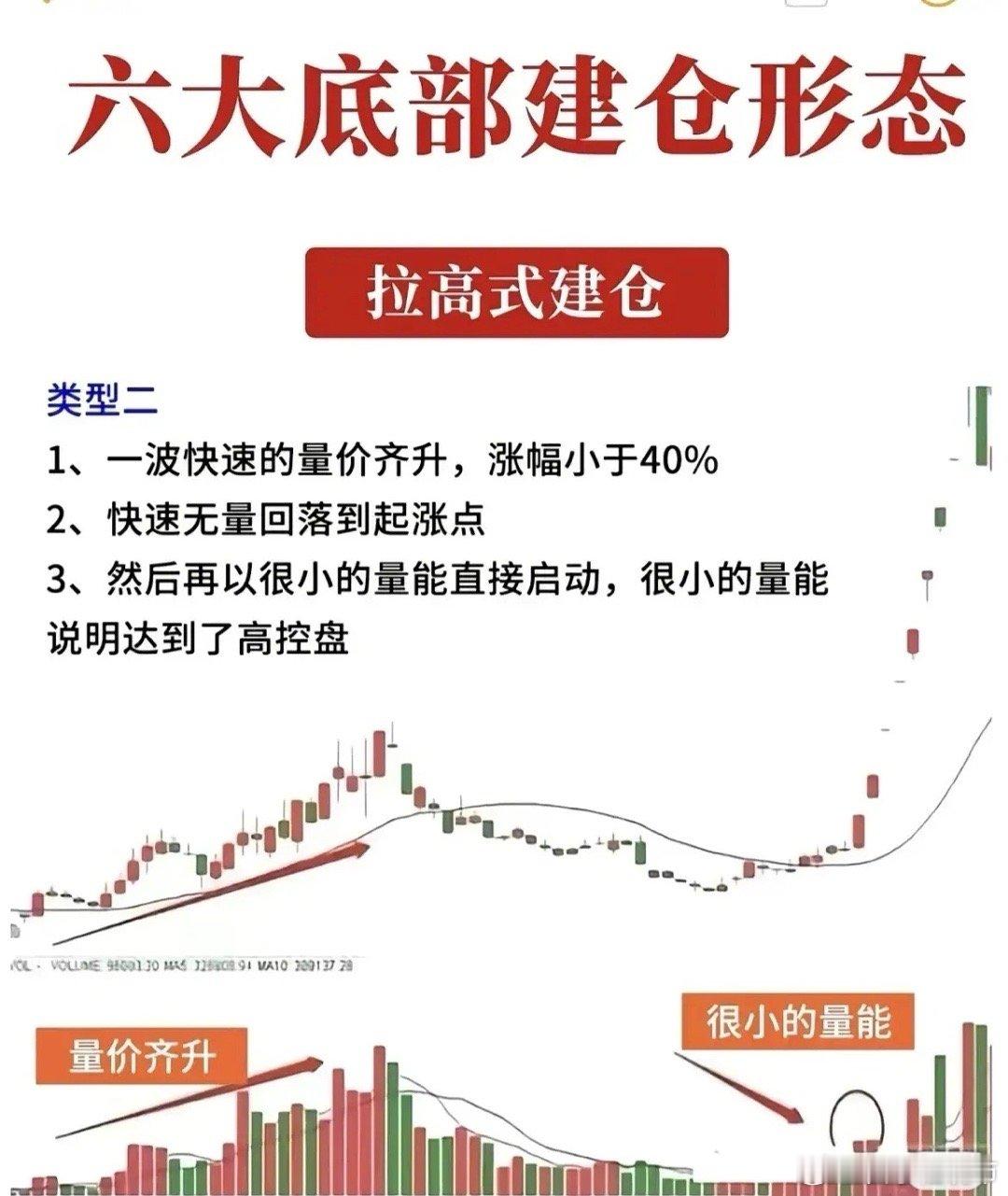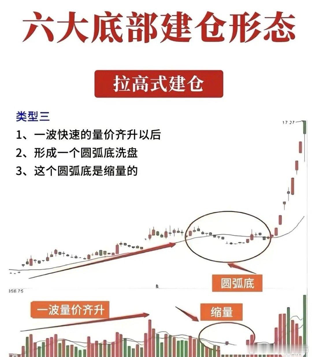 - 类型一:回调止跌型量价与形态的逻辑链为:① 出现一波明显的量价齐升——上涨时成交量放大,下跌时缩量,主力吸筹意图清晰;② 这波拉升的涨幅不超过40%(避免过早暴露意图或引发过度跟风);③ 拉升后开始回调,且回调至这一波涨幅的50%位置便止跌企稳;④ 随后出现放量突破前高的阳线,即为明确的出手点,代表主力完成洗盘并开启主升。- 类型二:无量回落型走势特点为:① 先有一波快速的量价齐升,涨幅小于40%,主力初步完成筹码收集;② 接着快速无量回落至起涨点——无量下跌说明抛压极轻,主力控盘度已达到较高水平;③ 随后以很小的量能直接启动,小量能表明筹码锁定性好,主力只需少量资金即可推动股价上行。- 类型三:圆弧底洗盘型建仓过程呈现三个阶段:① 先有一波快速的量价齐升,主力初步推高股价并吸筹;② 随后形成一个圆弧底的洗盘形态——股价缓慢下探后逐步回升,整体呈圆弧状;③ 这个圆弧底的整理过程是缩量的,说明市场抛压衰竭,主力在低位进一步巩固筹码,后续放量突破圆弧底颈线时,往往伴随加速上涨。