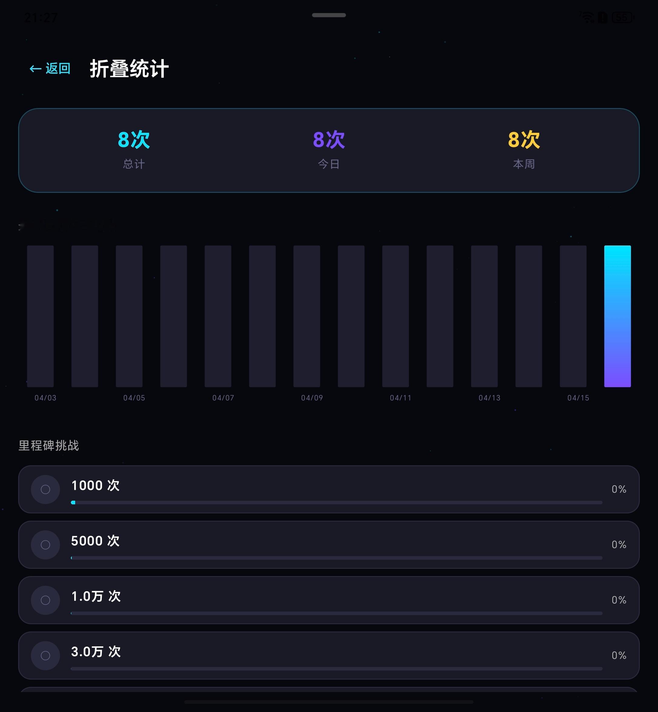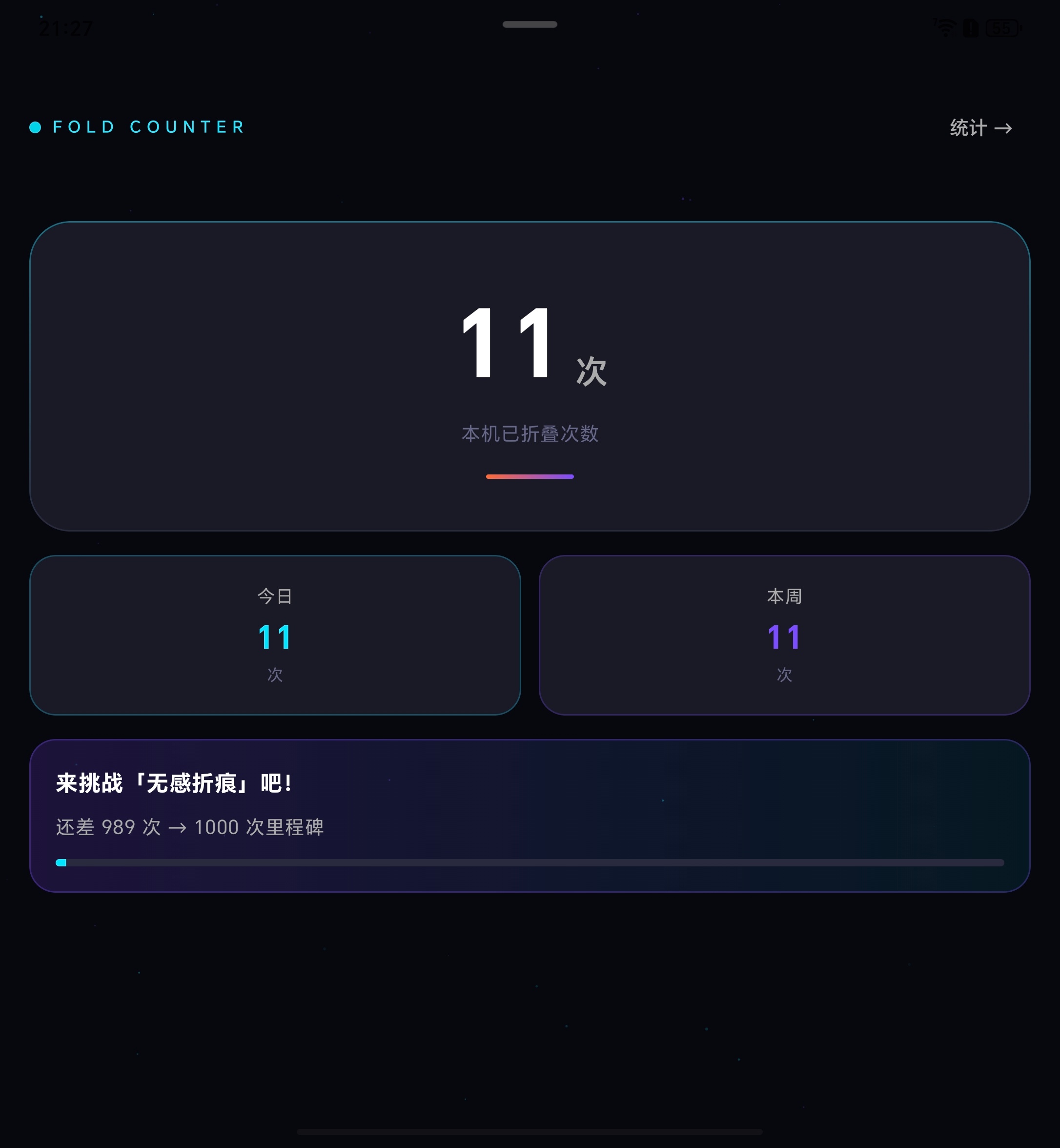 我感觉我又行了,开发了一个,折叠屏统计的APK, 功能就是统计折叠屏,折叠的次数,还有小组件功能实时显示折叠的次数, 还有里程碑挑战,折了多少次会发一个奖杯啥的,有趣的功能