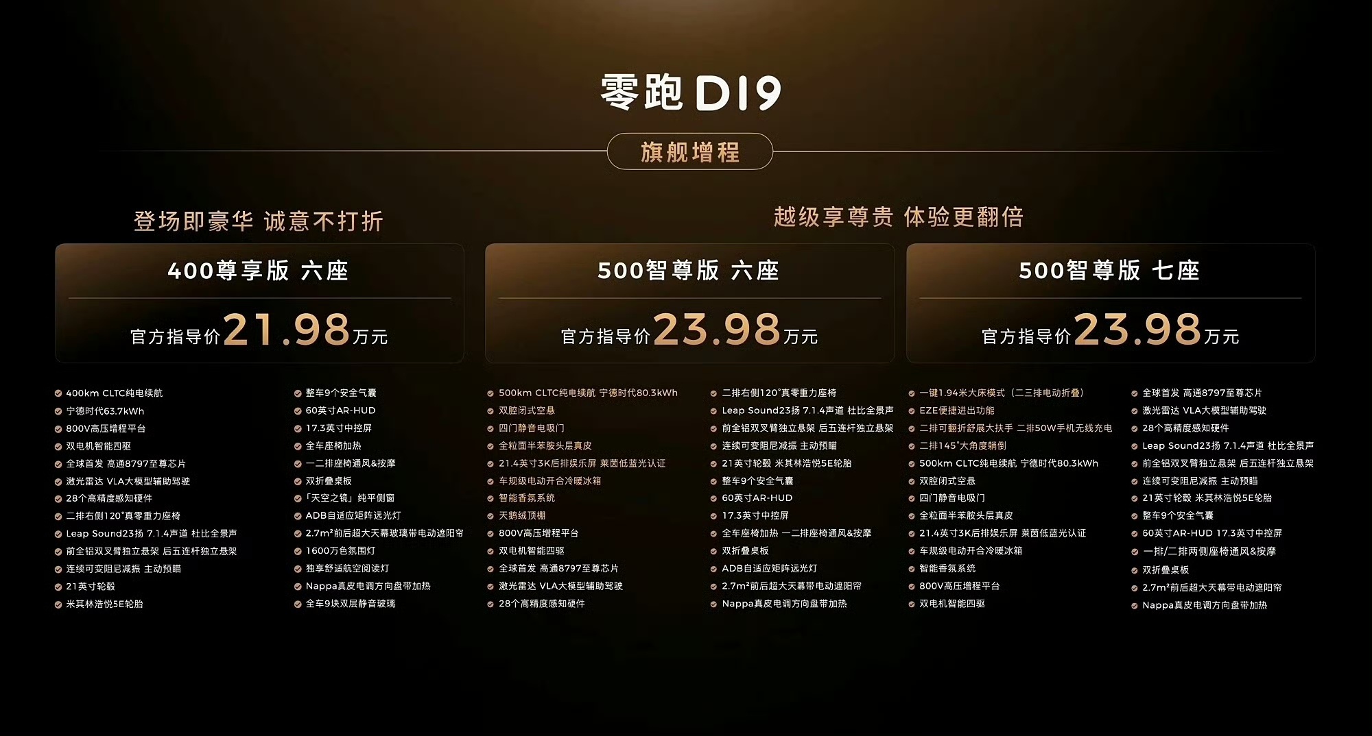 纯电版620智尊版 :官方指导价23.98万元720智驾版 :官方指导价24.98万元680三电机性能版 :官方指导价26.98万元原来9系旗舰SUV价格也能这么香零跑发布会零跑D19满配豪华上市21.98万起