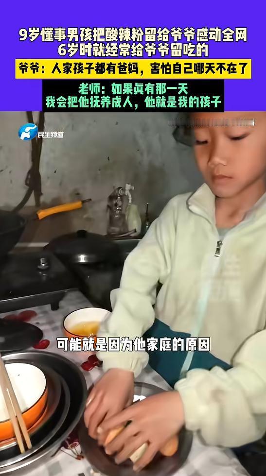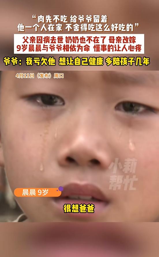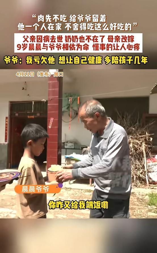“看哭了!”河南周口,一男孩父亲因病去世,他和爷爷相依为命,男孩怕失去爷爷,所以每次校园餐里面的肉都舍不得吃,留着放学带回家给爷爷,老师知道后,感动落泪,让男孩爷爷不用担心,如果真有那一天,自己会把男孩抚养成人!网友:太心疼了! 事情发生在河南周口一间昏暗的院子里,9岁的晨晨背着书包放学回家,一进门就从书包最深处,小心翼翼掏出一个用纸巾层层包裹的小包,动作轻柔得像是在呵护什么珍宝,打开纸巾里面安安静静躺着两块红烧肉,这是他当天中午在学校吃午饭时,偷偷省下来的,一口都没舍得吃。 没人知道这个才9岁的孩子,每天在学校吃午饭时,都在默默挑拣饭菜里的肉,只吃米饭和青菜,把仅有的肉块小心翼翼藏起来,包好放进书包,直到班主任发现他的异常,反复追问之下,晨晨才忍不住哭了出来,说出了藏在心里的秘密,爸爸走了奶奶也走了,他只剩下爷爷一个亲人,他怕爷爷也会突然离开自己。 三年前晨晨的父亲突染重疾,未能战胜病魔,永远地离开了他和家人,父亲离世后母亲难以承受生活重压而改嫁,自此鲜少探望晨晨,刹那间晨晨的世界崩塌了一半,爷爷年纪大了,没有稳定收入,只能靠在家种菜、养鸡,勉强维持祖孙俩的生活,还要长期吃药,日子过得十分清贫。 对一个9岁的孩子来说,没有复杂的生死哲学,他不懂什么是生老病死,只单纯地认为,吃得好、身体好,就能活得久,所以他每天省吃俭用,把校园餐里最珍贵的肉块省下来,小心翼翼包好带回家,放学后第一件事,就是把肉掏出来递给爷爷,希望爷爷能多吃点肉,补补身体,能陪自己更久一点。 晨晨总是笑着跟爷爷说自己在学校吃过了,还说自己都吃腻了,可只有他自己知道,他有多想吃一口那块香喷喷的红烧肉,爷爷看着孙子递过来的肉,眼眶瞬间红了,心里又酸又疼,却硬着头皮不肯吃,执意要让晨晨自己吃,祖孙俩僵持了很久,最后还是互相妥协,两块小小的红烧肉,在昏暗的灯光下,你一口我一口分着吃完,每一口都藏着彼此的牵挂。 爷爷一开始是想拒绝的,他知道孙子正是长身体的时候,更需要补充营养,可后来他慢慢明白了,孙子省肉给自己,不是单纯的孝顺是害怕,是恐惧失去他这个唯一的亲人,孩子的想法很天真,他以为只要爷爷多吃肉,就能长命百岁,就能一直陪着自己,就能让他不再孤单。 班主任得知这件事后,当场就落泪了,她看着这个懂事得让人心疼的孩子,又看着年迈无助的爷爷,紧紧握住爷爷的手,郑重地做出承诺,说如果真有那么一天,爷爷不在了,她会把晨晨当成自己的亲生孩子一样养大供他上学,不会让他无依无靠,这不是客套话,是她发自内心的承诺,是想给这个可怜的孩子一份安全感。 爷爷听完老师的话,声音低沉地说出了自己的顾虑,家里接连出事,他年纪大了,身体也不好,自己也不清楚还能活多久,他什么都不担心,唯一放心不下的,就是这个才9岁的孙子,怕自己走后,孙子没人照顾、没人疼,也正是因为这份牵挂,爷爷做了一个决定,不管再苦再难,都要好好活下去,多陪孙子几年,不让他再承受失去亲人的痛苦。 4月13日这件事被媒体报道后,很快引发了全网关注,村委会和妇联也第一时间介入,给祖孙俩送去了生活物资和慰问金,还建立了长期帮扶机制,希望能帮他们减轻一点负担,让晨晨能安心上学,让爷爷能安心养老。 舆论场里“看哭了”成了大家最高频的评价,无数网友留言感叹晨晨太懂事、太让人心疼,这么小的年纪,就扛起了不属于他的责任,用自己笨拙的方式,守护着唯一的亲人,有人说看惯了太多冷漠,这样纯粹又真挚的祖孙情,真的能治愈人心,也让人忍不住心酸。 可静下心来想想,一个9岁的孩子,他的“懂事”从来都不是天生的,是命运的无常,让他没有别的选择,父亲走了母亲离开了,他只能紧紧抓住爷爷这根救命稻草,他怕失去爷爷,怕自己变成无依无靠的孩子,所以才拼命想抓住一切能抓住的东西,一块肉、一包零食,都是他对抗无常、守护爷爷的方式。 (信息来源:《怕爷爷去世,9岁男孩每天偷偷把肉带回家:爸爸去世,妈妈改嫁,和73岁爷爷相依为命;老师哽咽:如果真有那天,我会把他抚养成人》钱江晚报)