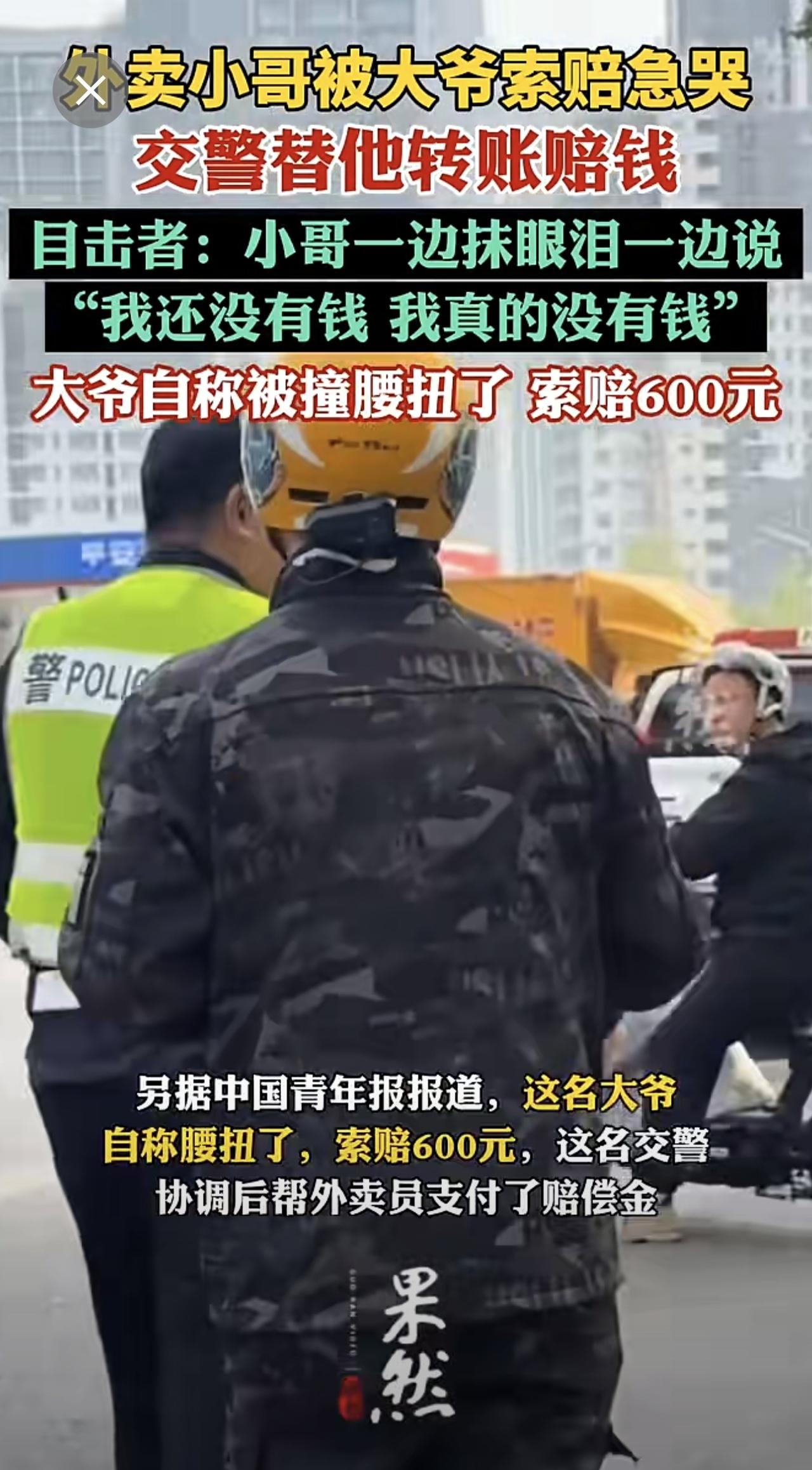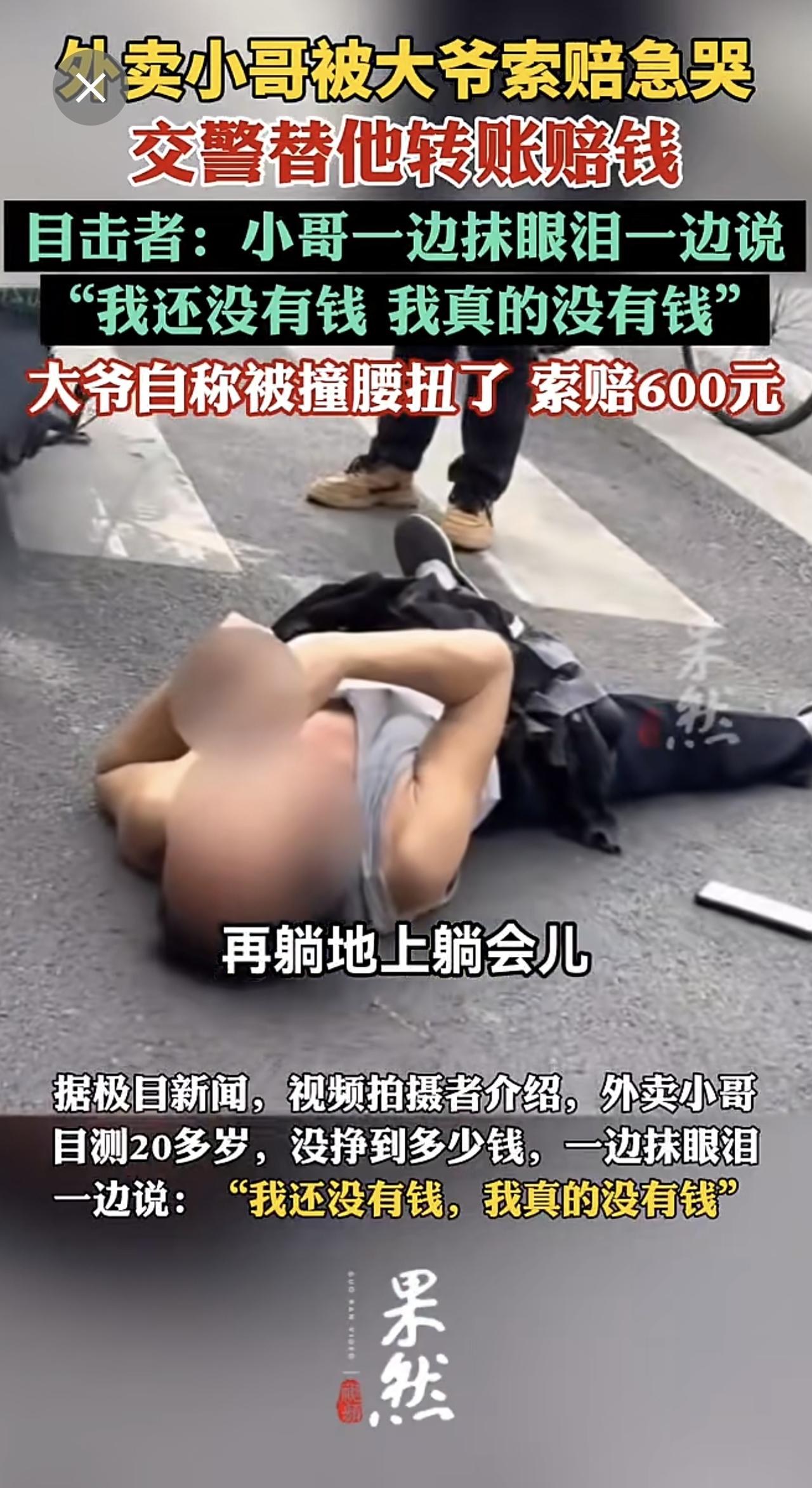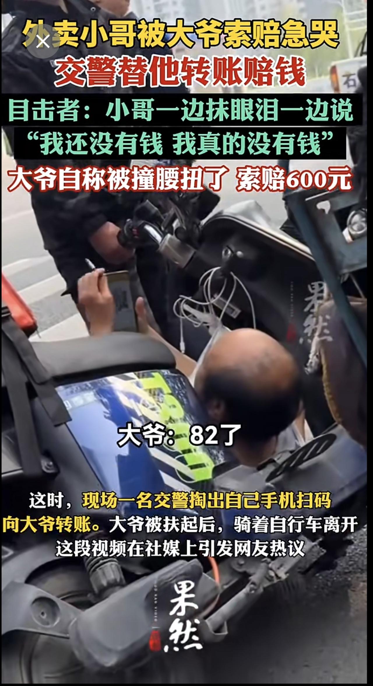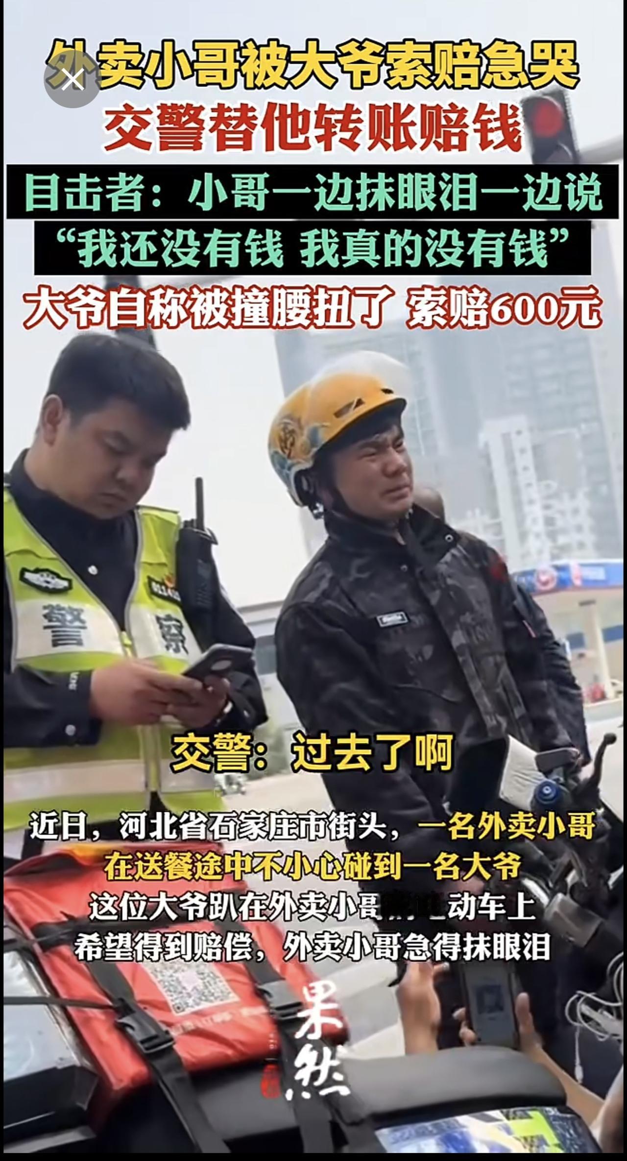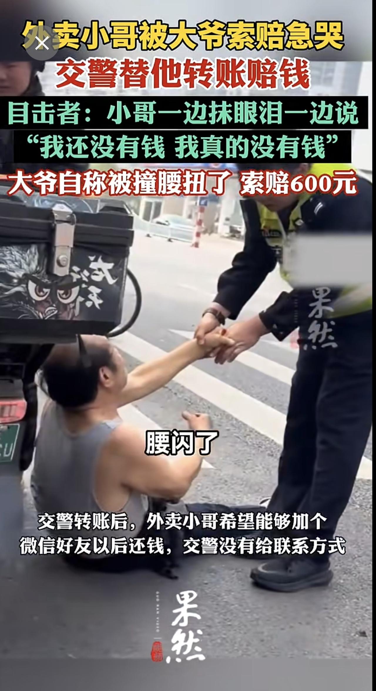 外卖小哥被大爷索赔急哭交警帮赔钱.