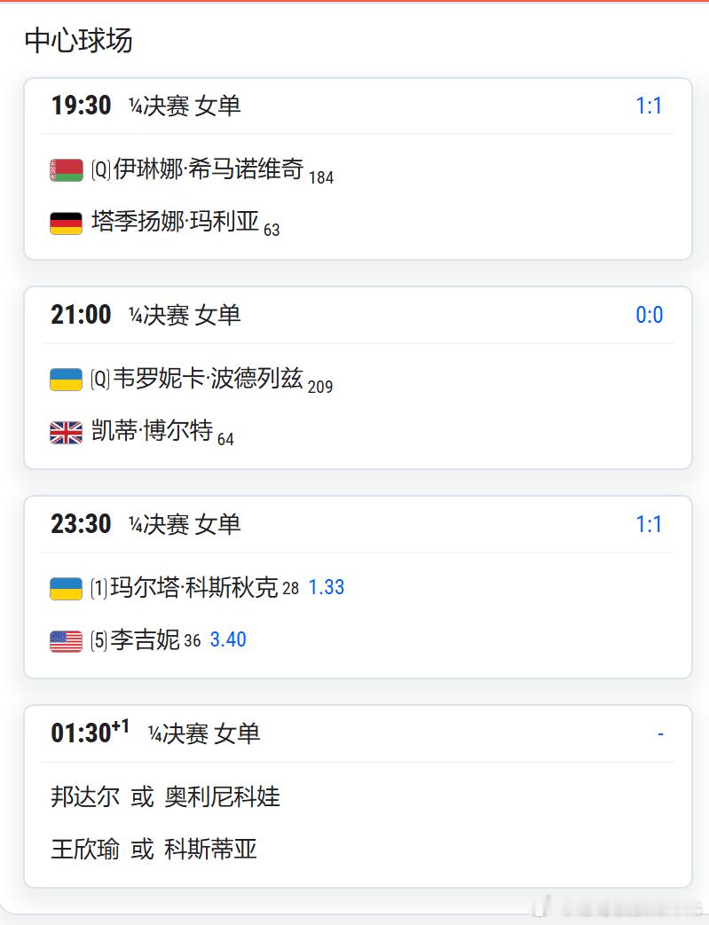 WTA500斯图加特诺斯科娃 vs 斯维托丽娜 北京时间:18:30 穆霍娃 vs 高夫 北京时间:不早于20:00斯瓦泰克 vs 安德列娃 北京时间:23:00 雷巴金娜 vs 费尔南德斯 北京时间:不早于00:30