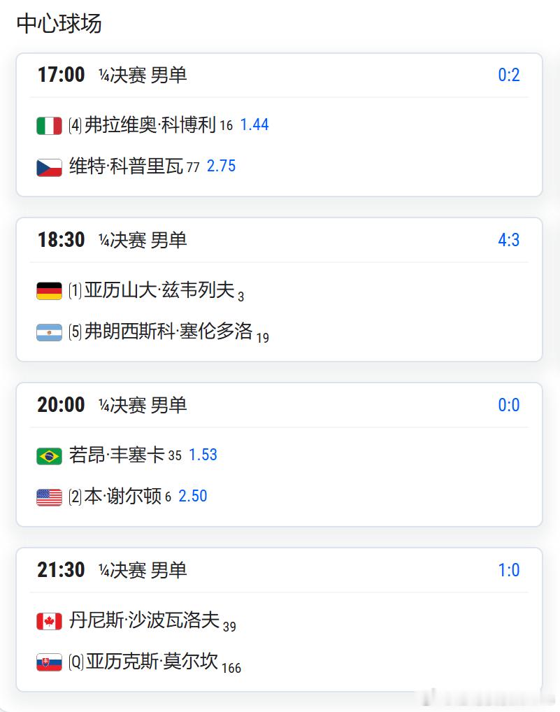 ATP500慕尼黑兹维列夫 vs 塞伦多洛 北京时间:不早于18:30丰塞卡 vs 谢尔顿 北京时间:不早于20:30