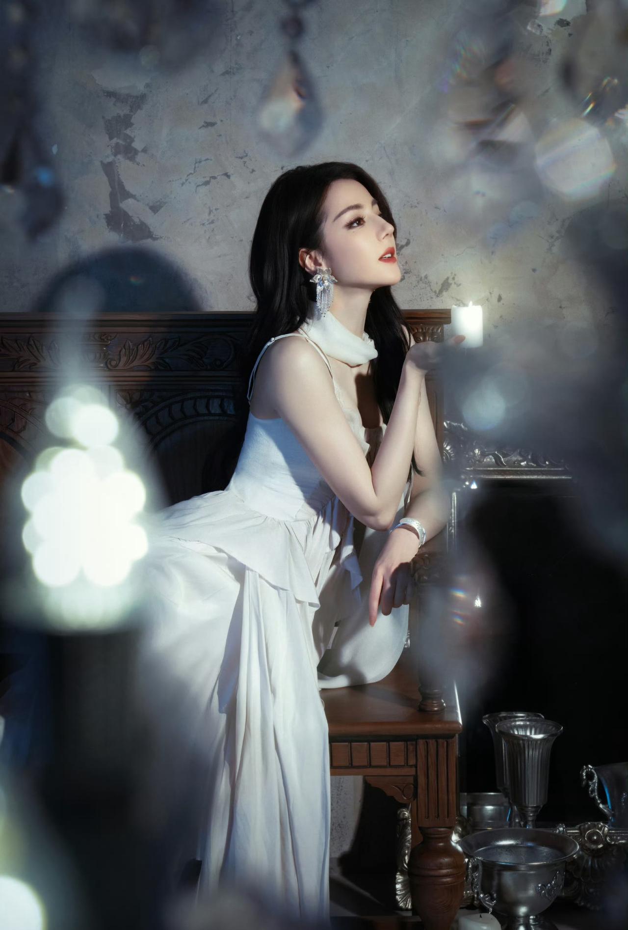 白裙以纯白薄纱搭配层叠荷叶边剪裁,肩部线条与不规则裙摆凸显清冷仙气。工作室官方描述为“冷光落在指尖,万物寂静有声”,画面中她抬手触及光影,营造出神秘疏离的戏剧张力。部分粉丝发现裙身暗藏精细工艺细节,吊带设计则完美展现其肩颈曲线,整体被形容为“古堡月光女神”或“神的审视”。 冷色调光影的沉浸式表达 造型通过冷光滤镜强化氛围感,与《白日提灯》中鬼王“贺思慕”的清冷人设高度契合。剧迷称其“将角色灵魂穿在身上”,诗句“荷叶罗裙一色裁”、“仰望之境”频繁被引用,强调白裙与古装角色的跨次元呼应。