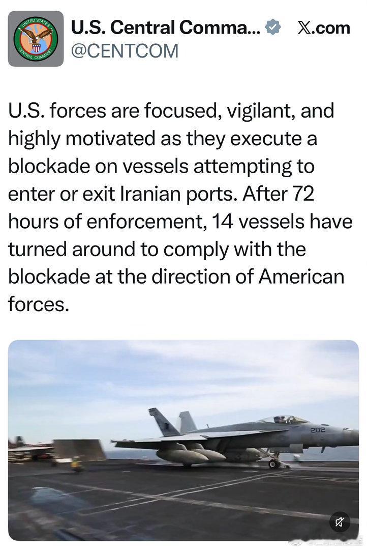 美军官宣:对伊朗港口实施封锁七十二小时内,共十四艘船依照指示返回